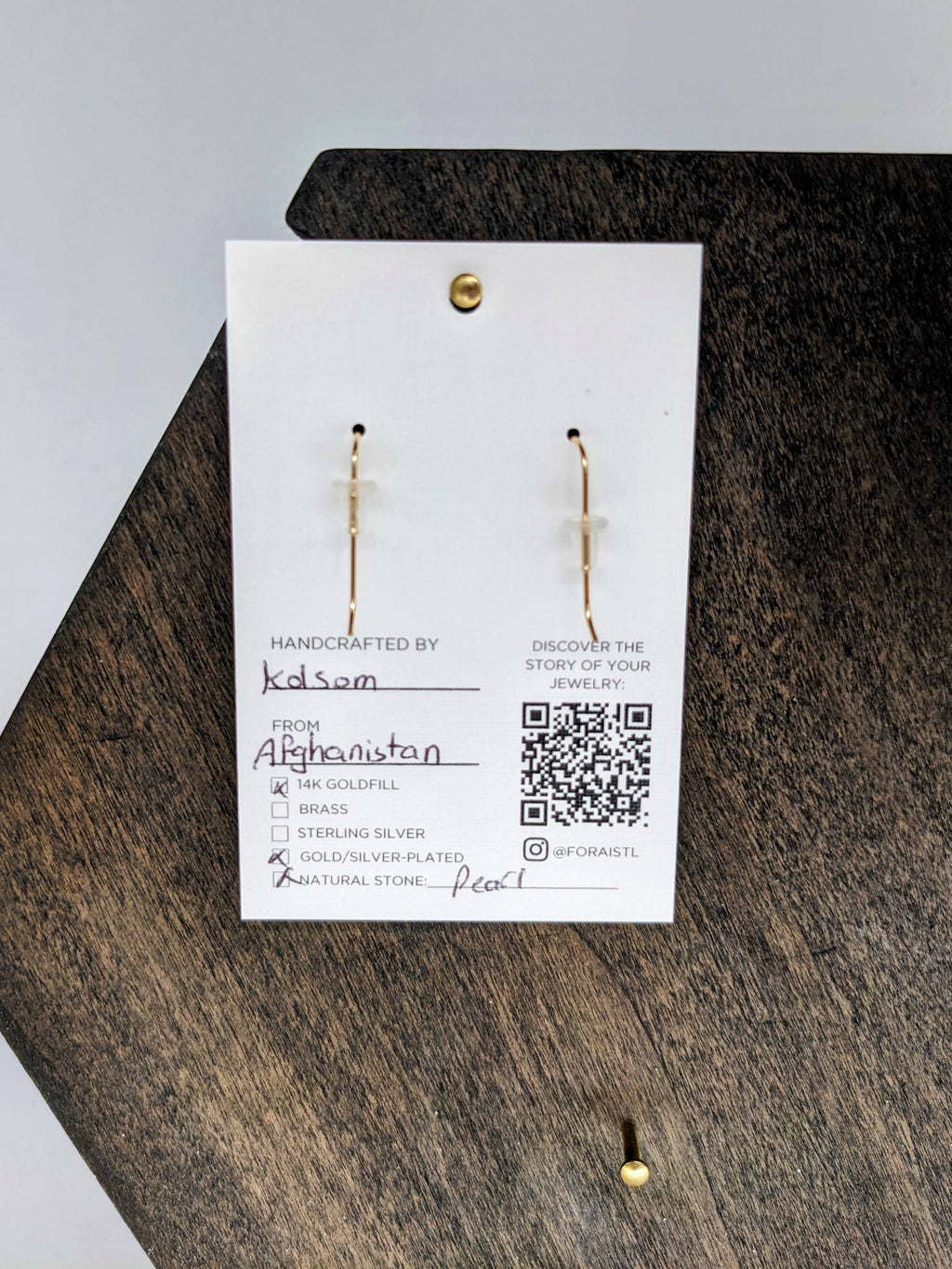 SUSTAINABILITY AND VALUES: Women-founded and run brand. Designed by an all-female team in St. Louis, MO. 14k gold filled ear wires and findings sustainably-sourced in Albuquerque, NM. Hand-crafted by fairly paid, resettled refugee and immigrant women in St. Louis, MO.