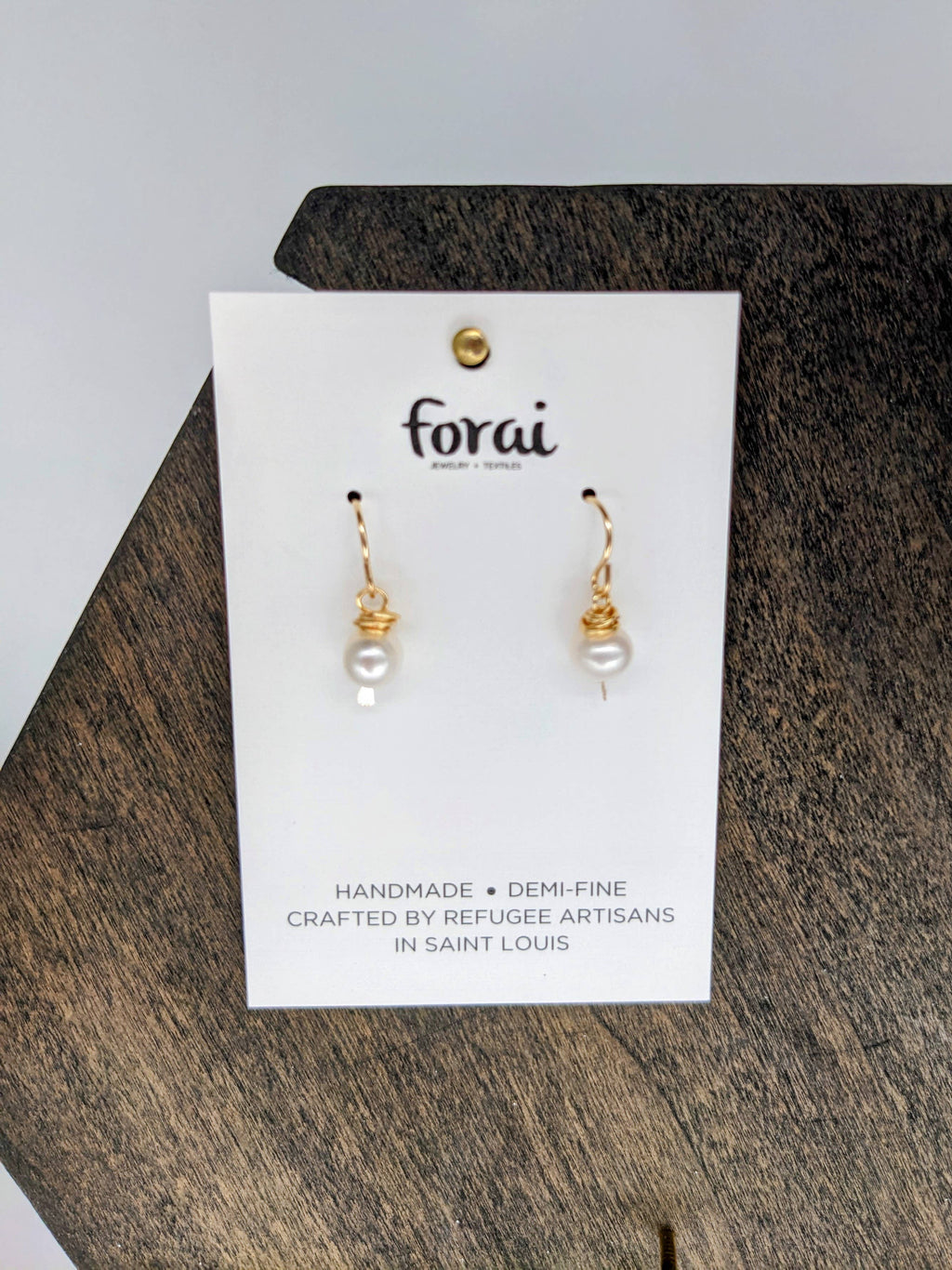 Dainty gold earrings with freshwater pearls and hammered detail add a touch of elegance to any outfit. Named after one of our refugee artisans from Afghanistan. 14k gold filled ear wire and findings. Freshwater pearls. Drop 3/4"