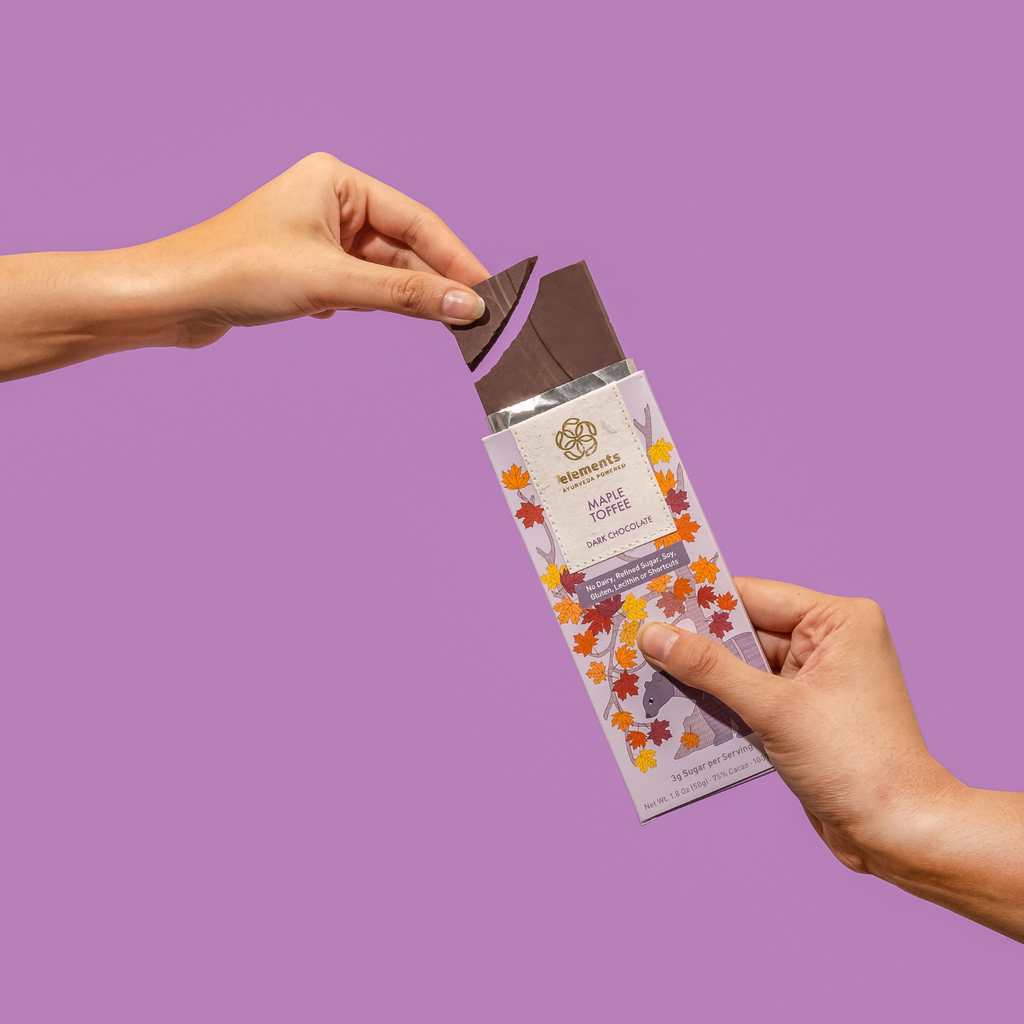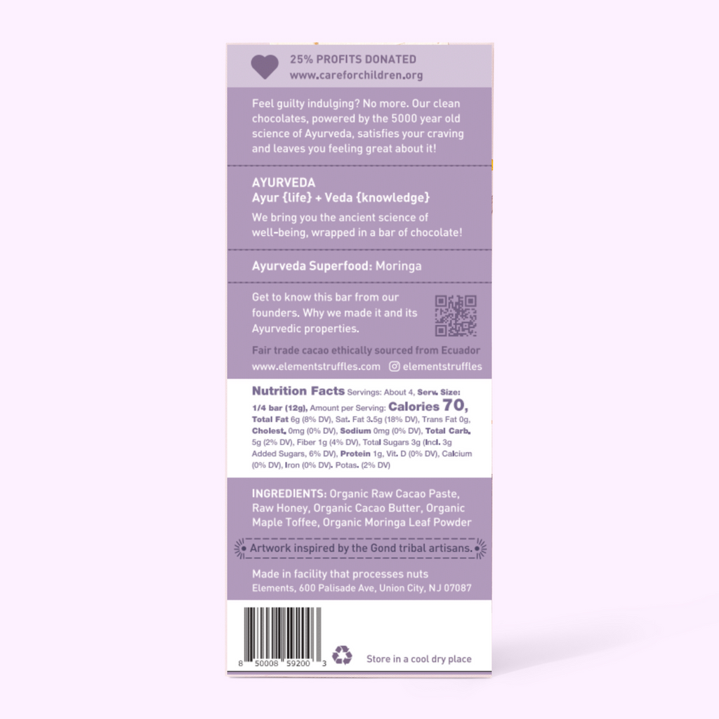Of course, like everything else from Elements, Maple Toffee bar is free from dairy, refined sugar, soy, lecithin, sugar alcohols, natural flavors, gluten or absolutely anything artificial. Think of it as a treat made from only two core ingredients: Organic Cacao and Organic Coconut Sugar! A dash of Moringa and Maple Syrup are also added for functional benefits and unique sweetness!