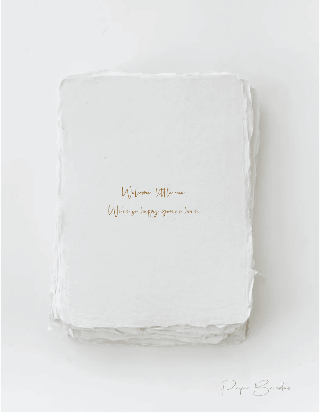 (Upcycled + Fair Trade + Gives Back) Beautiful paper. Made by beautiful people. For a beautiful cause. Our handmade deckled edge paper collection is letterpress printed in-house late at night with lots of coffee. This card is meant to be treasured for years to come. Handmade paper beautiful enough to frame and helps us ensure there was no slave labor in our supply chain. 10% goes to fight for human rights in the supply chain. Saying: "Welcome Little One! We are so glad you are here!" Baby Card 4.25"W x 5.5"L Color: White Letterpress Antique Gold Ink Grey Euro Flap Envelope to match ink. Sleeved with Recycled Material and labeled. 1 Sided Card, Blank Back to write on. Ethically made by Artisans, Hand printed in our USA studioYou may also like