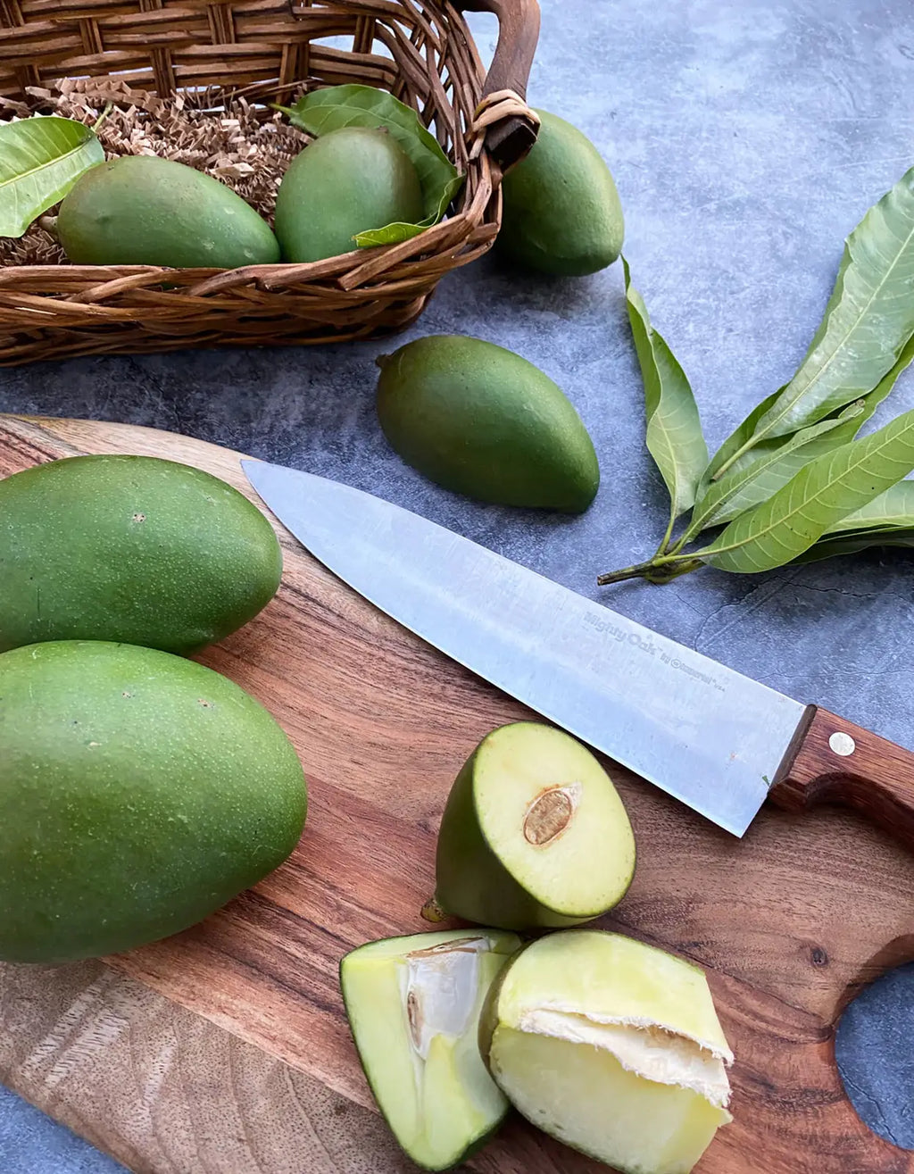 Our mouth-watering, blissfully delicious Raw Mango Pickles are made from luscious green mangoes, organic aromatic Indian spices and organic extra virgin olive oil. In India, pickles are called “achaar” – they’re an ancient favorite, dating back about 4,000 years! But of all of the pickles in India, it’s the Aam Ka Achaar – the Indian Mango Pickle – that takes the pickle-cake (so to speak)! By far, it’s the most popular and most beloved pickle of all. At Pure Indian foods, we make our Aam Ka Achaar from luscious green mangoes, aromatic, health-promoting Indian spices like turmeric, ginger, hing and black seed, and extra virgin olive oil, all slowly marinated to create a mouth-watering, blissfully delicious treat. HEAT LEVEL: MEDIUM HOT Our pickles are: - Small Batch - Locally Made - Limited Edition - Cleanest Ingredients - Treasured Family Recipe - No chemical preservatives like sodium benzoate and potassium sorbate. - No added colors, artificial flavors, sugar.