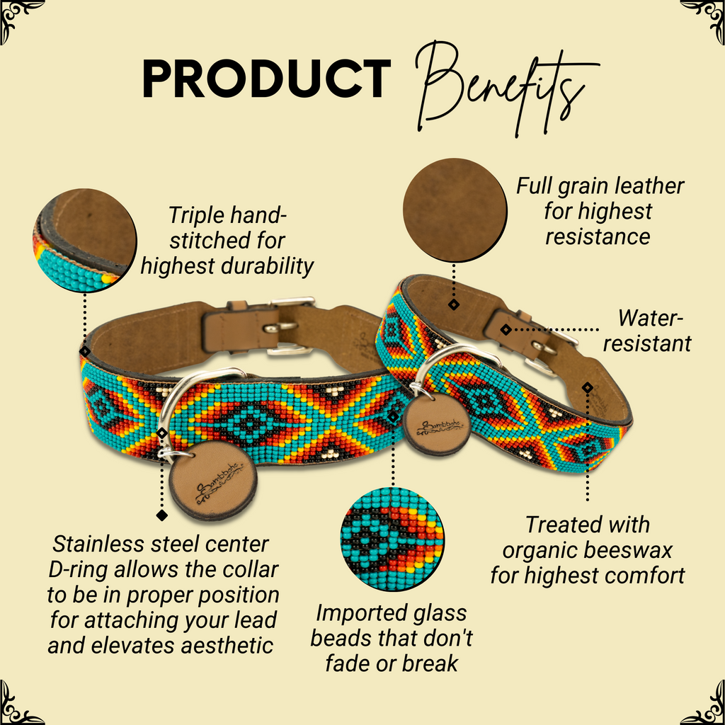 Our dog collars are luxury master pieces, completely unique and handmade by artisan women in Brazil. The vibrant colors, sun reflecting beads and unique design will make your little baby shine. Our pieces use full grain leather which is the highest rating for leather quality. Because full grain leather has the full, complete grain of the hide, it is the most durable leather and is solely used by luxury brands. This feature makes this collar very flexible and comfortable for your fur baby. Our leather is treated with organic beeswax which makes it suitable for outdoor activities such as hiking and the beach. Please note that our leather is purposely un-dyed and very pliable to provide your little pup with the highest comfort. Each bead is made of unbreakable glass and stitched one by one following the ancient Brazilian tradition of “tear beading” to make the stitching indestructible. This stitching method allows for resistance to scratching so you can be assured that the beads will not fall off. The strong buckles are water resistant, so mud and water playdates are allowed. This association of high-end materials combined with artisanal expertise in the manufacturing process make our collars very long lasting and unique. Please note that your purchase will contribute to the sustainable development and empowerment of artisan women from the community of Araxa in Minas Gerais, Brazil.