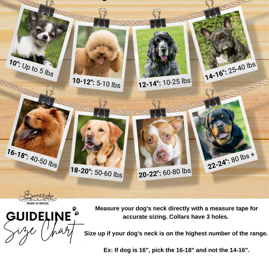 Our dog collars are luxury master pieces, completely unique and handmade by artisan women in Brazil. The vibrant colors, sun reflecting beads and unique design will make your little baby shine. Our pieces use full grain leather which is the highest rating for leather quality. Because full grain leather has the full, complete grain of the hide, it is the most durable leather and is solely used by luxury brands. This feature makes this collar very flexible and comfortable for your fur baby. Our leather is treated with organic beeswax which makes it suitable for outdoor activities such as hiking and the beach. Please note that our leather is purposely un-dyed and very pliable to provide your little pup with the highest comfort. Each bead is made of unbreakable glass and stitched one by one following the ancient Brazilian tradition of “tear beading” to make the stitching indestructible. This stitching method allows for resistance to scratching so you can be assured that the beads will not fall off. The strong buckles are water resistant, so mud and water playdates are allowed. This association of high-end materials combined with artisanal expertise in the manufacturing process make our collars very long lasting and unique. Please note that your purchase will contribute to the sustainable development and empowerment of artisan women from the community of Araxa in Minas Gerais, Brazil.