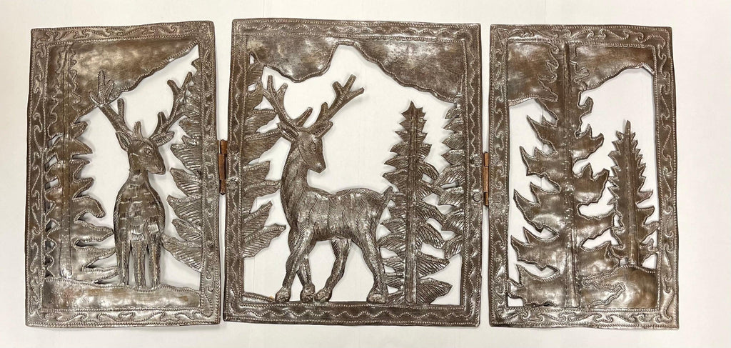 Bring the peaceful beauty of nature into your home with this stunning tri-fold metal art piece featuring a majestic deer against a serene mountain backdrop. Handmade by Haitian artisans from repurposed oil drums, each foldable panel is carefully cut and detailed, showcasing incredible craftsmanship and creativity.
