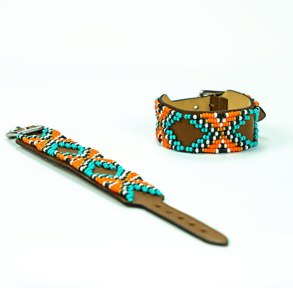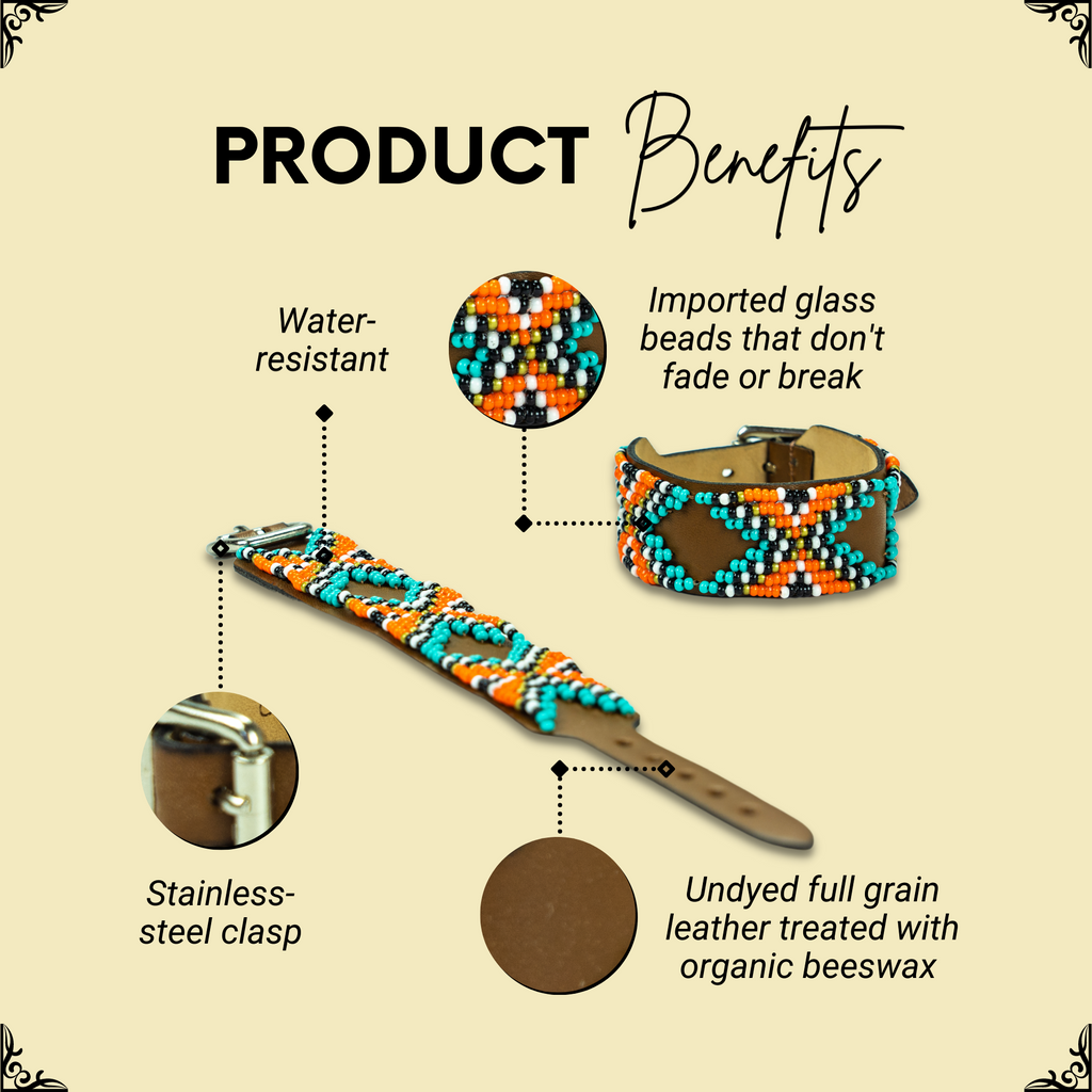 This incredible beaded bracelet from Sambboho is the perfect addition to your jewelry box. Fully handmade by female artists in Brazil. Premium leather bracelet made with world renown Slovakian glass beads. Our leather is un-dyed, full grain, and treated with organic beeswax for water resistance. Western, bohemian and native inspired designs with vibrant colors. Sustainable shopping! Your purchase allows these women to be financially independent and safe. Thank you for making a difference in their lives. This bracelet matches with the dog collar, hatband and belt from the same collection! Hypo allergenic stainless-steel closing. Flexible leather, very comfortable to wear for an extended period of time! As always, your purchase comes with a 30-days return policy and a 1-year warranty. Fast free shipping from the US.