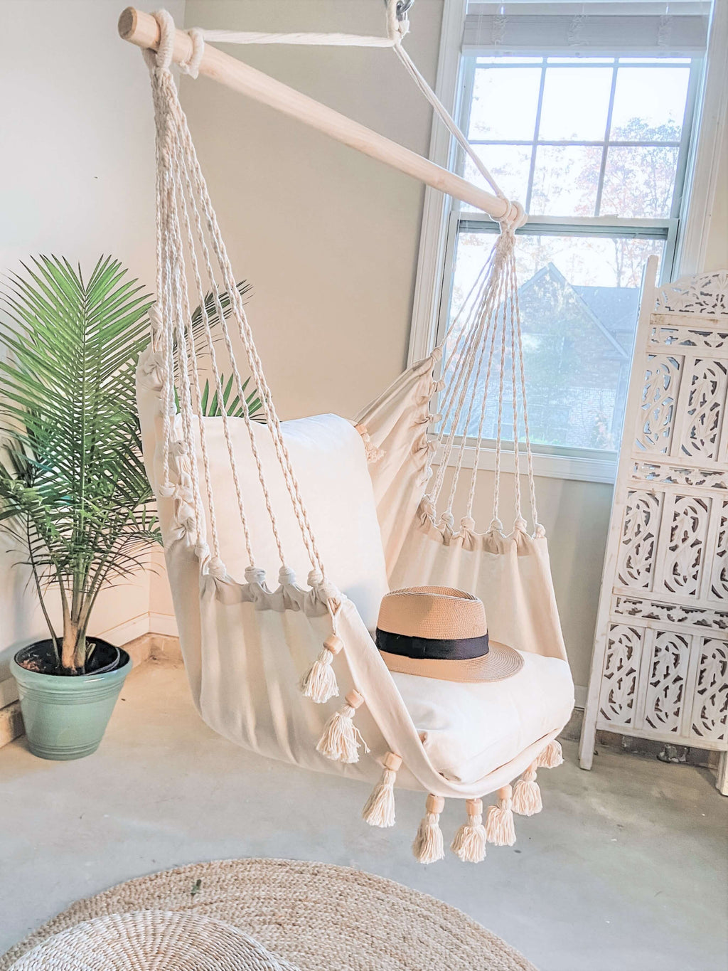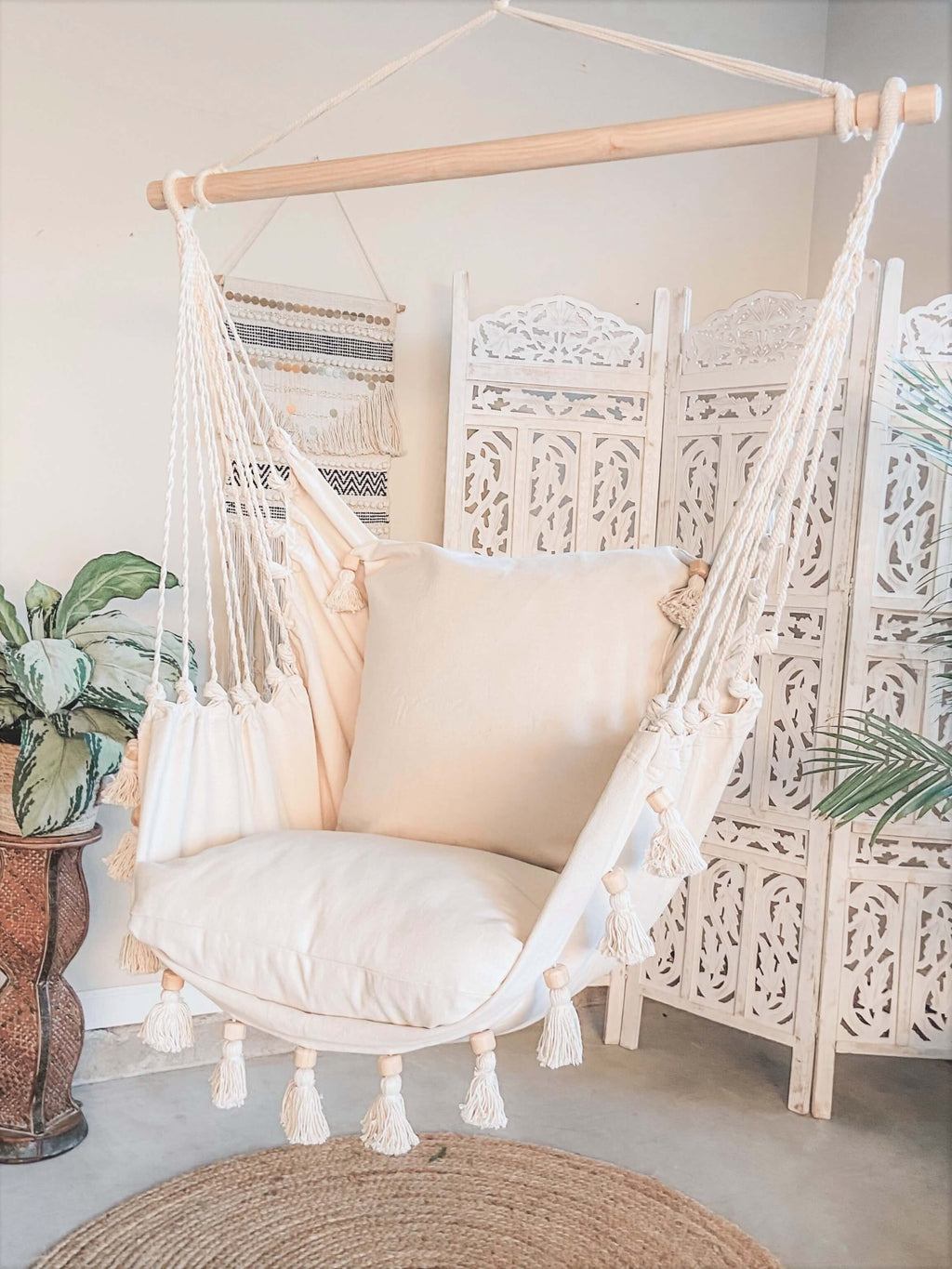 Decorative tassels are essential accessories for any bohemian interior. Bring your dream home to life with this beautiful boho hammock chair adorned with tassels and coordinating pillows. This hanging chair is ideal for both indoor and covered outdoor use.