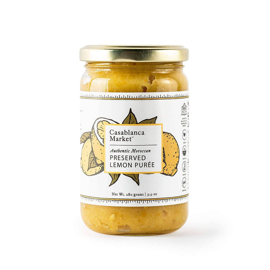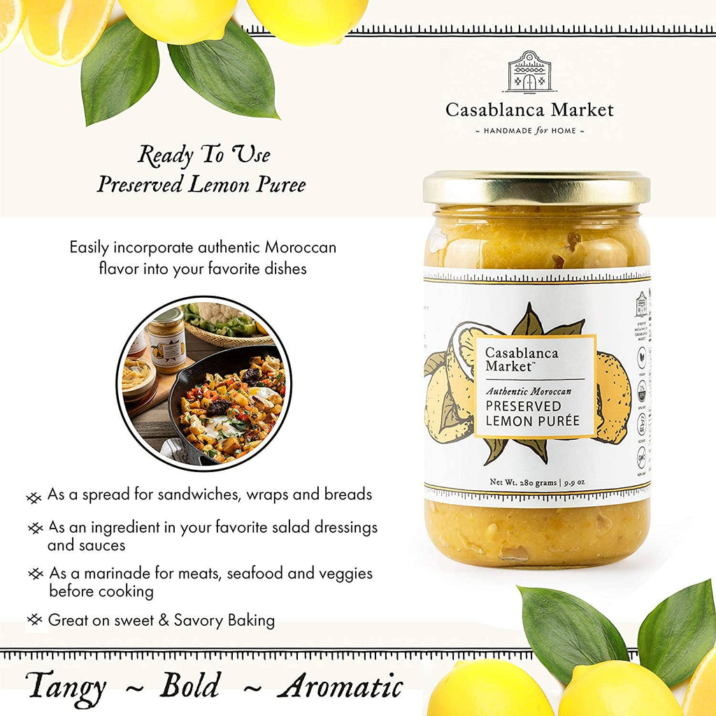 Casablanca Market Lemon Puree. Our preserved lemon puree add flavor to everything from tagines, stews, braised dishes, sauces, and aioli, to vegetables, salads, pastas, sandwiches, wraps, meats, poultry, seafood, and cocktails. it is great for sweet and savory baking and so easy to use and will transport your dishes to a whole other level! How To Use: Spread on toast, sandwiches, and wraps. Mix in salad dressings. Marinate or Rub on meats, poultry, fish, and vegetables before cooking. Great for sweet and savory baking. Your Impact: Support local food makers, preserve artisanal & cultural heritage, and help protect the planet. Size: 9.90 oz.