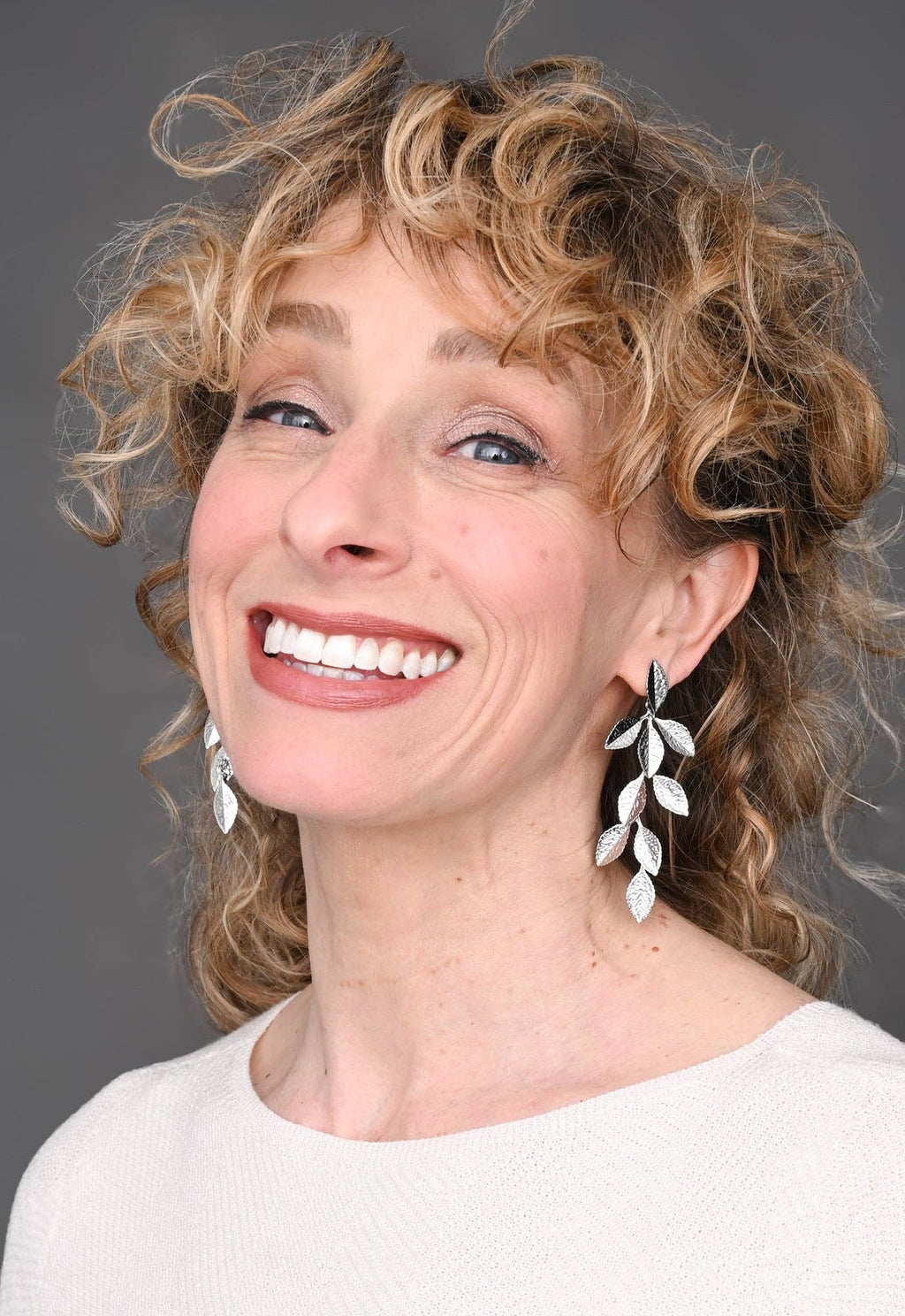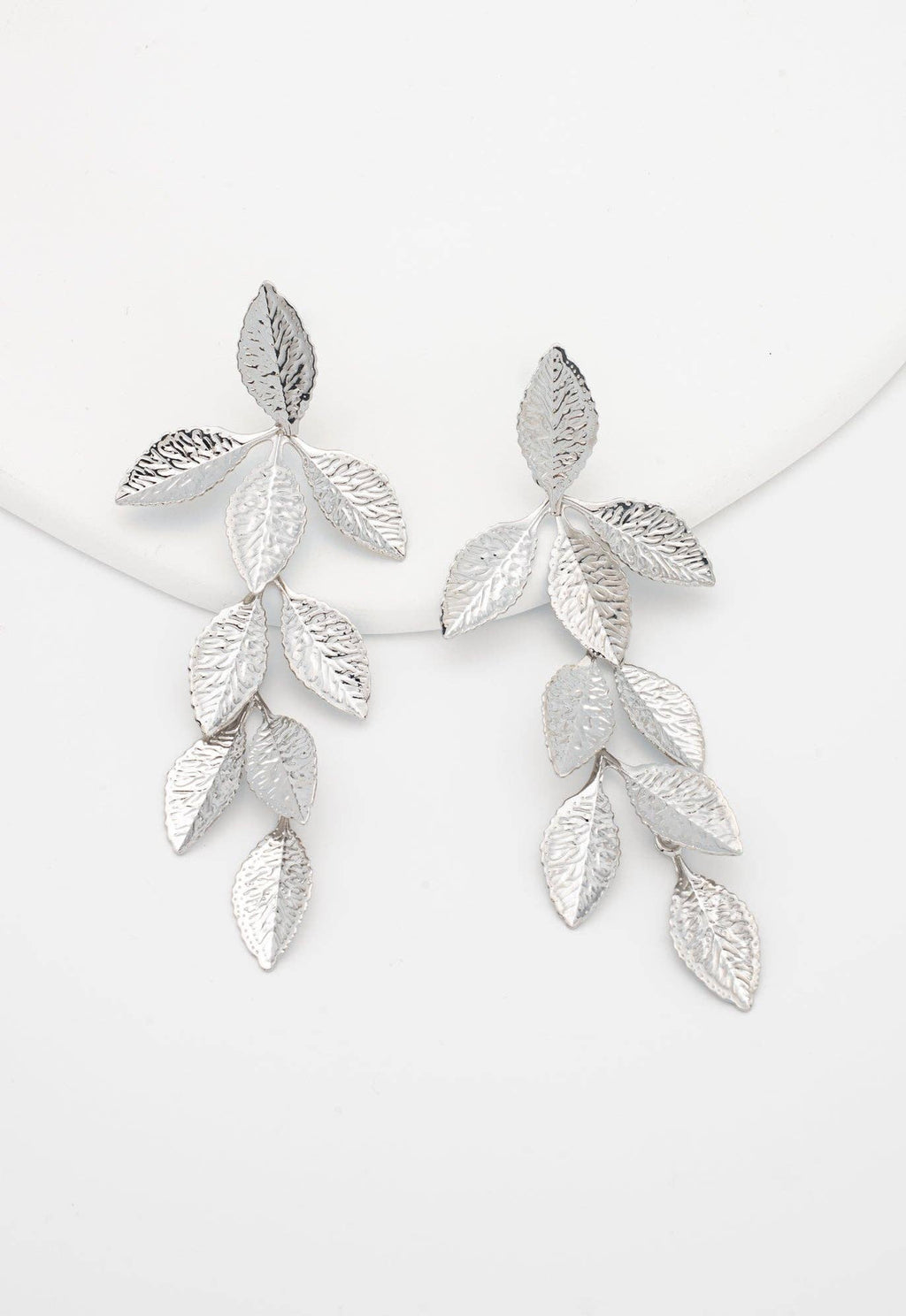 Inspired by the graceful sway of willow branches in the breeze, our Cascade Leaf Earrings are a symbol of resilience and beauty. Delicate leaves with intricate textures shimmer in radiant platinum gold, reflecting light with every movement. These cascading leaves shimmer with every movement, symbolizing the strength and resilience found in nature—and in each of us. When you wear and gift the Cascade Leaf Earrings, you are part of a story of transformation—helping a survivor build a new future with safe work, education, and the confidence to flourish. Box size and color may vary. Materials: Platinum plated brass earrings Hypoallergenic; lead and cadmium free with nickel content less than 100 ppm. Size: 2.9 inches