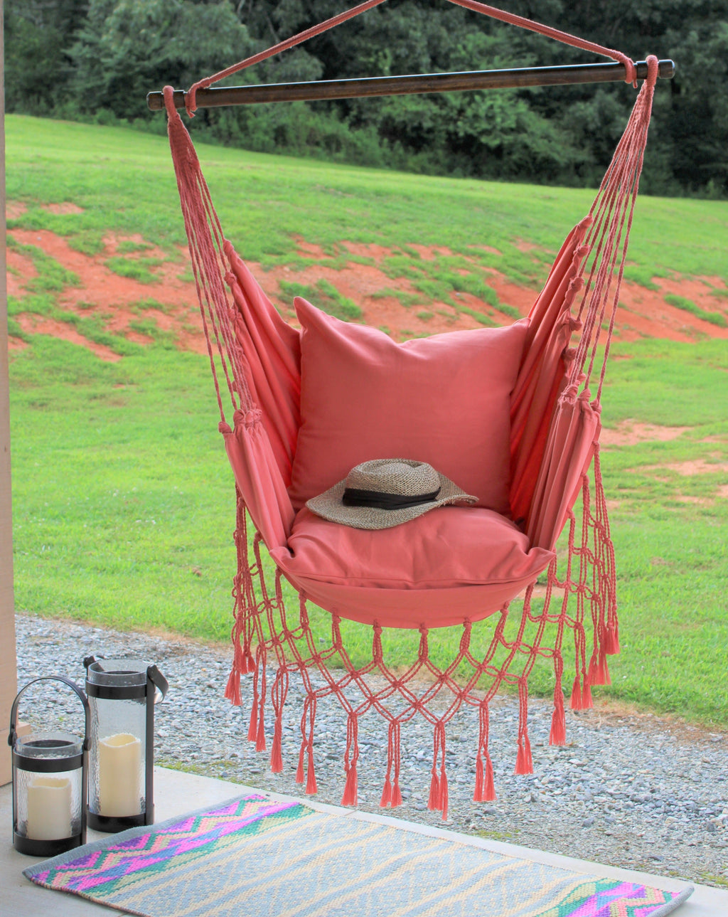 This is the perfect coral pink pillow cover that will add a playful touch to your seating area. This coral pink color will add a tender boho touch to your hammock or home decor. It's comfortable and provides a more casual, loungey feel.