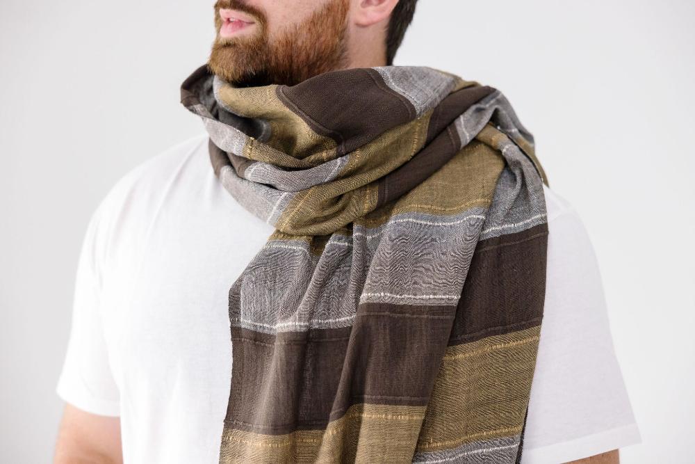These cotton wraps were originally designed by the internationally renowned designer, Marina Spadafora. The Danakil is a light weight shawl that plays with color and texture. The shawl is woven with light-weight Ethiopian cotton with thicker lines of hand spun cotton throughout. The blocks of color are separated by areas of light, where the weavers have left the warp threads open. The shawls are finished with our signature hand braided fringes. The shawls are named after the Danakil depression, the lowest point in Ethiopia, and an area of extreme beauty.