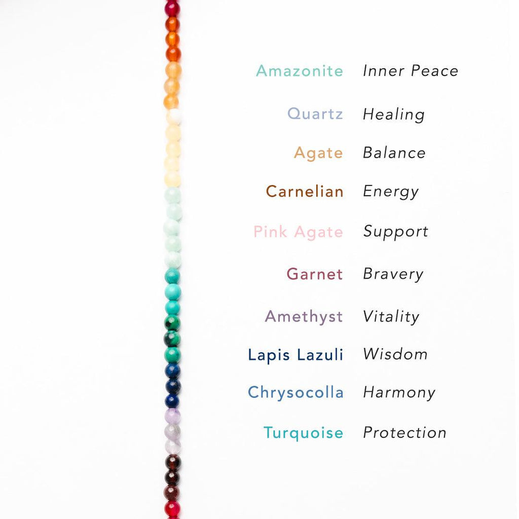 Each piece features powerful energy stones: Amazonite (Inner Peace), Quartz (Healing), Carnelian (Energy), Garnet (Bravery), Amethyst (Vitality), Lapis Lazuli (Wisdom), Agate (Balance), and Turquoise (Protection).