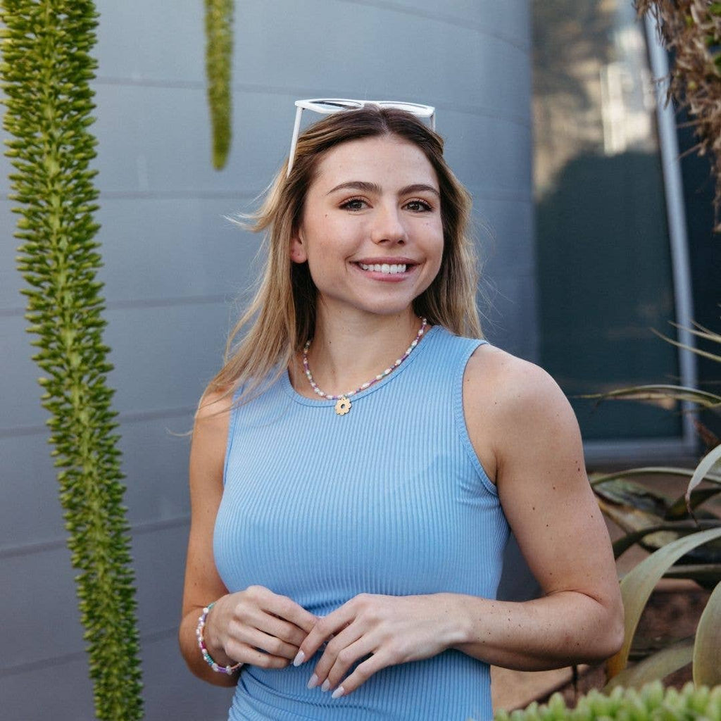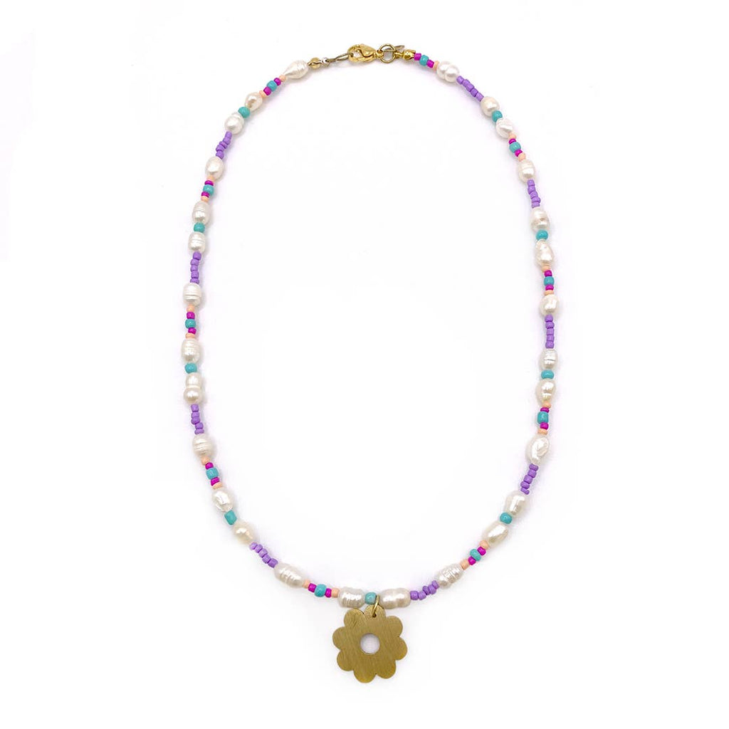 You can wear this statement Flora Daisy necklace alone to add a splash of color to a neutral outfit, or go bold and layer it with strands of pearls and a gold chain. Featuring glass beads, freshwater pearls, and finished brass accents we love the colors and know your customers will too! We love it paired with our Daisy Hoop Earrings and stretchy bracelet and anklet. This ethically handmade necklace is made in the Philippines, and tells the world that your customers stand for freedom because their purchase gives back to young women escaping human trafficking. Every piece has a PURPOSE! -Made with brass, glass beads, and freshwater pearls -16 1/2" drop -Lobster clasp