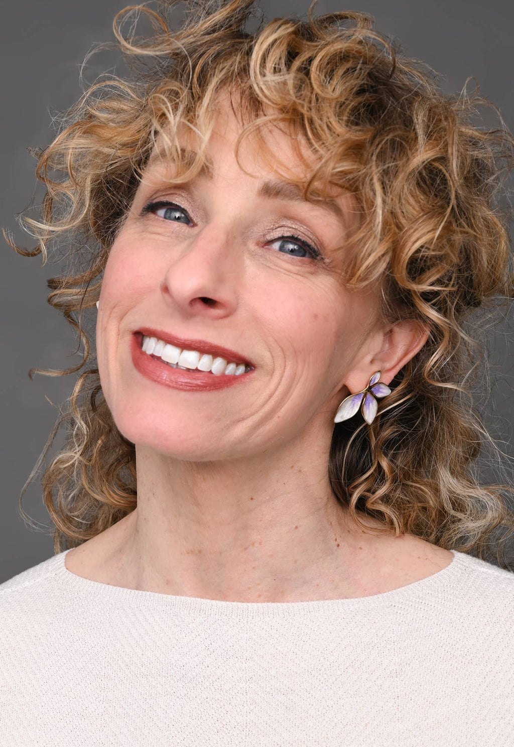 A celebration of beauty and transformation, the Flourish Earrings feature modern, geometric petals hand-painted in glittering lavender enamel and framed in radiant 14K gold plating. Their artful design brings a fresh, elegant touch to any look—wear them with a flowing dress for effortless grace or let them add a pop of color to your everyday style. More than just earrings, they’re a symbol of hope. With every purchase, you help survivors of exploitation build a new future, creating ripples of change that flourish far beyond today. Box size and color may vary. Materials: 14k gold plated stainless steel with enamel earrings Hypoallergenic; lead and cadmium free with nickel content less than 100 ppm. Size: 1.34 inches