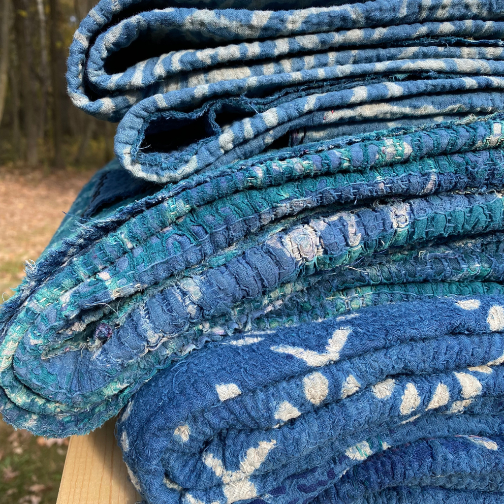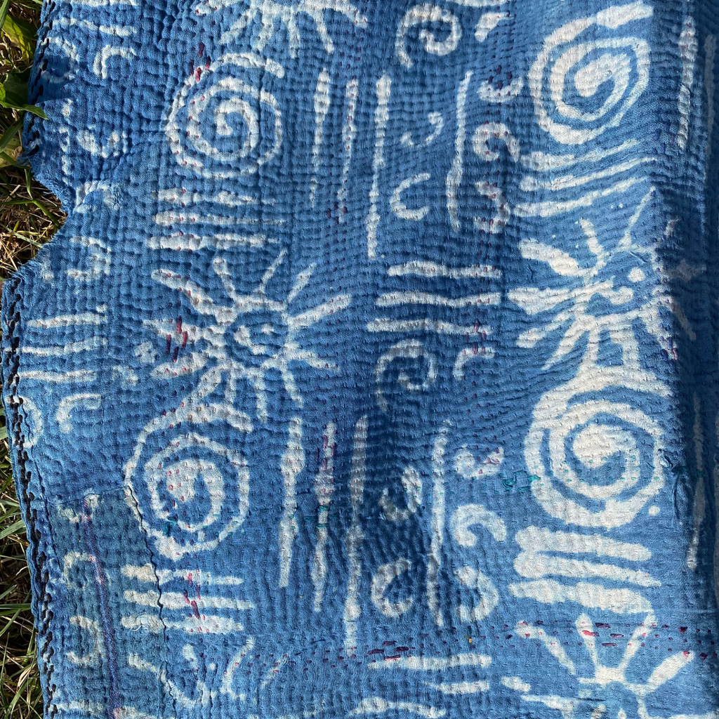 Textile lovers, this one is for you. The kantha collector, the one who appreciates the best. These are the special ones. These beauties are block printed, indigo dyed, and stitched with very tiny stitches. The kantha stitching is intricate, detailed, and the best we have seen. You can see the years of love in these 100% cotton beauties. There is wear revealing the under layers of fabric and patches that show the care. If you like a piece that has been loved and has signs of a story to tell this is for you. If you like new and perfect, probably best to walk away. Features: - Every one is unique - Each side is different - Sizes vary greatly (roughly 70-85 in. by 40-60 in. - Dry clean, spot clean, hand wash, gently cycle, or however you would care for your special textiles.