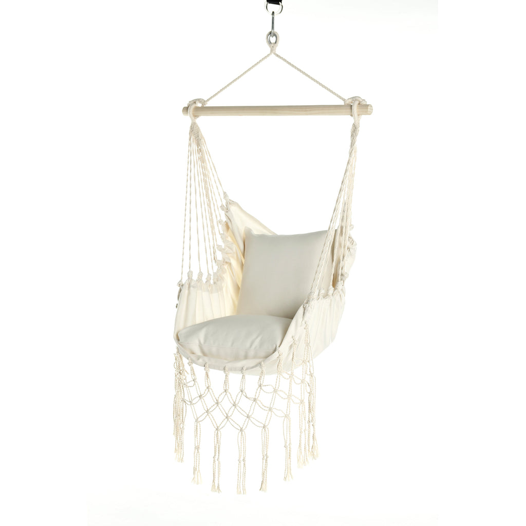 This solid 100% cotton canvas white hanging chair is an elegant blissful retreat that matches any modern decor. The soft cotton fabric cradles your body like nothing else in this world. The beautiful handmade macrame fringe adds a one-of-a-kind flair.