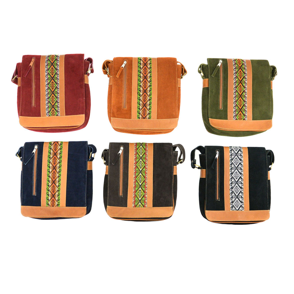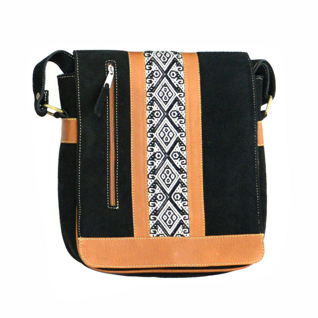 Quiet wealth at an affordable price. This unisex crossbody bag is artistically crafted with suede leather and accented with traditional Chumbi textile. Multiple zipper pockets. Adjustable strap. Magnetic snap closure on front fold-over. Made in Ecuador.