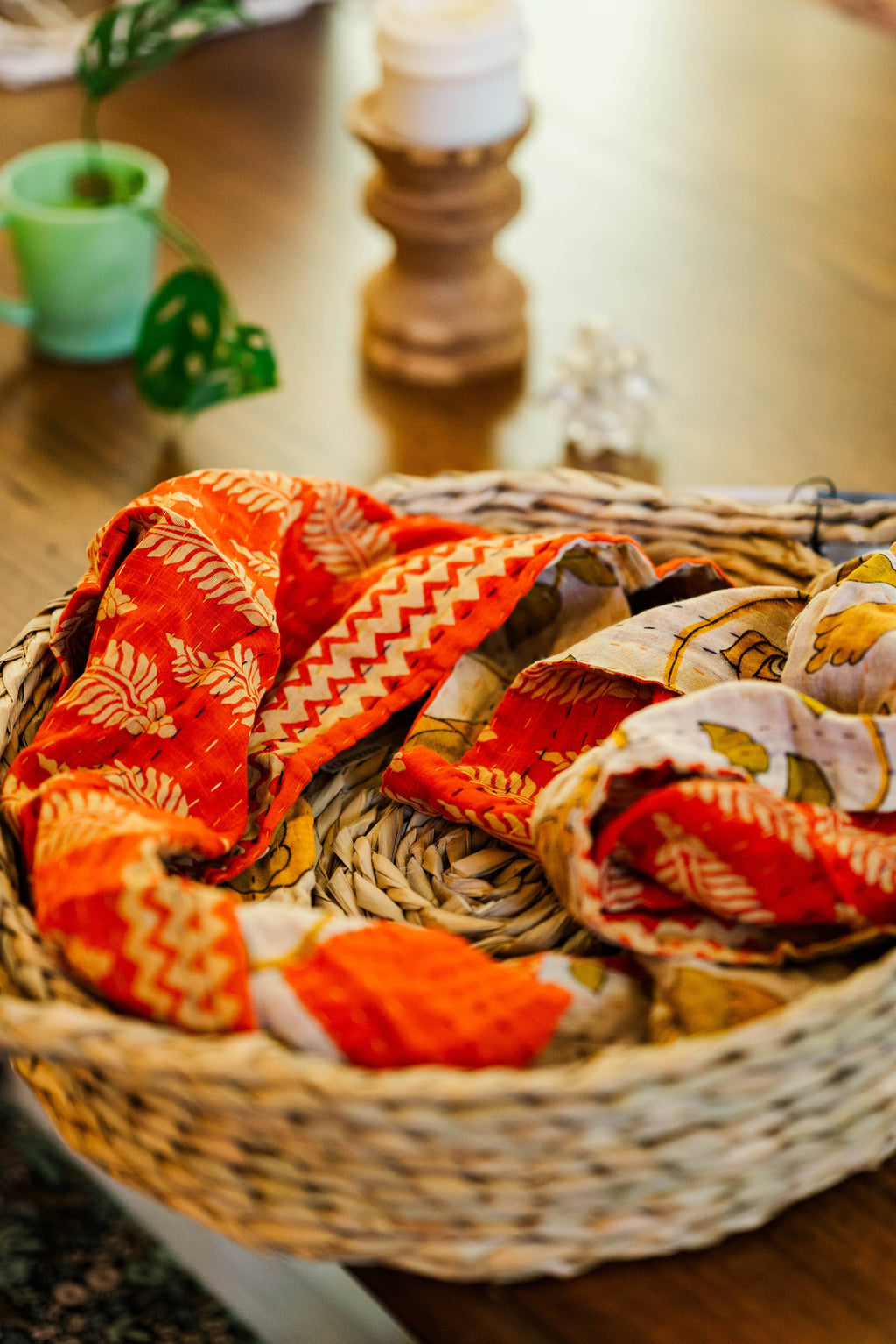 Recycled saree makes such an amazingly warm and cozy infinity scarf! Our Kantha Infinity Scarves are hand stitch with two coordinating saree fabrics to help brighten up your fall and winter wardrobe while secretly being amazingly comfortable! Size: Material: Recycled Saree Fabric Care Instructions: Wash gently. Tumble Dry. Love Well. Your purchase makes an impact Every Kantha Infinity Scarf set goes through the hands of 4 women and provides approximately 10 hours of work!