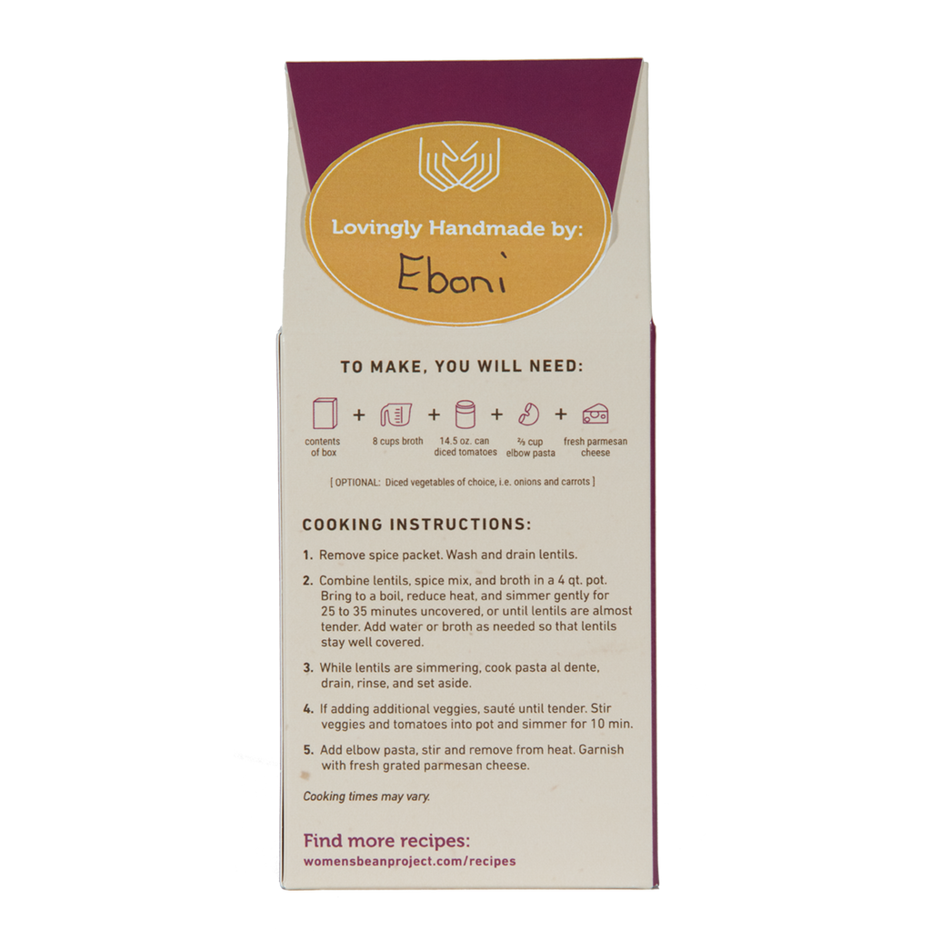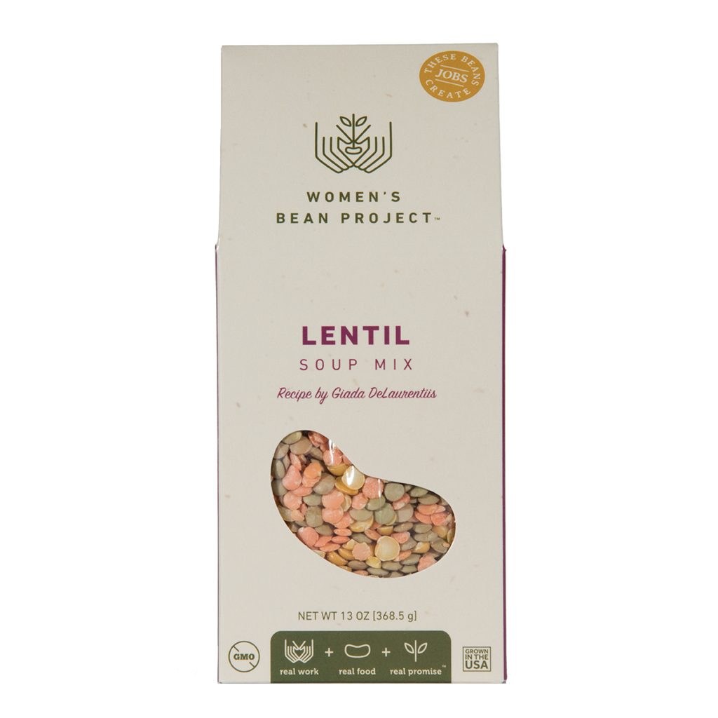 Women’s Bean Project’s Lentil Soup Mix, Recipe by Giada De Laurentiis with brown lentil, yellow split pea, red lentil beans, and a premium blend of spices tastes just like homemade lentil soup. Soup and chili mixes. Each box makes 7-8 servings Box comes sealed with a Lovingly Handmade Sticker Includes premium seasonings Prepare on the stove or in the slow cooker Non-GMO and Made in the USA.