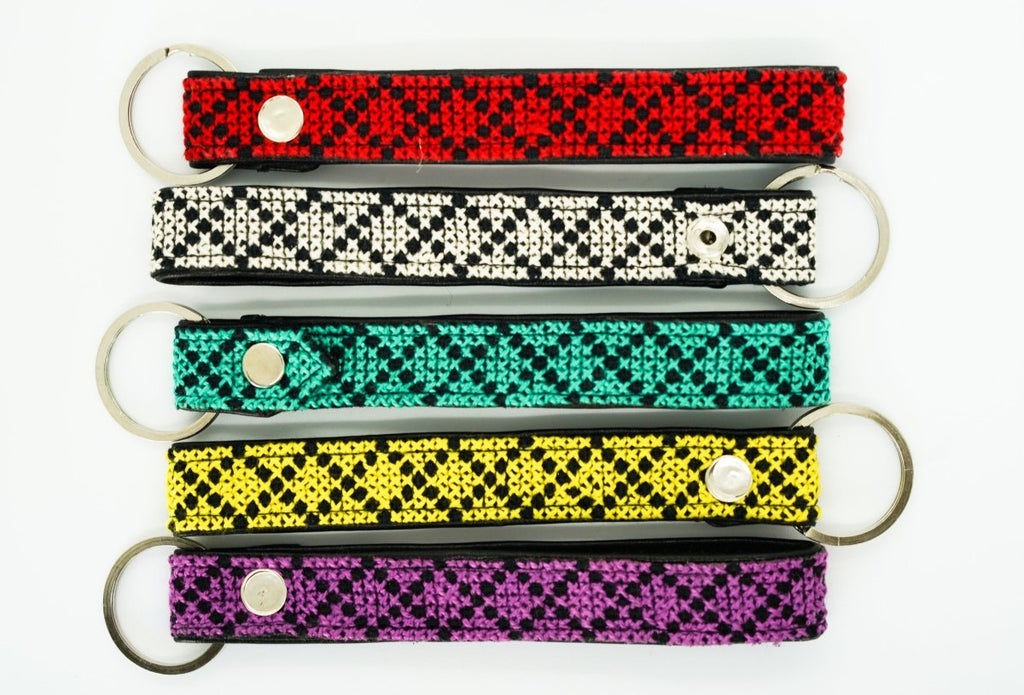 This leather key fob features the "Baker's Wife" tatreez motif (Mart Al Farran in Arabic). The design takes 1.5 hours for our Darzah artisans to embroider. Your purchase will support 1/5 of a day's empowering work for a talented woman artisan in Palestine.