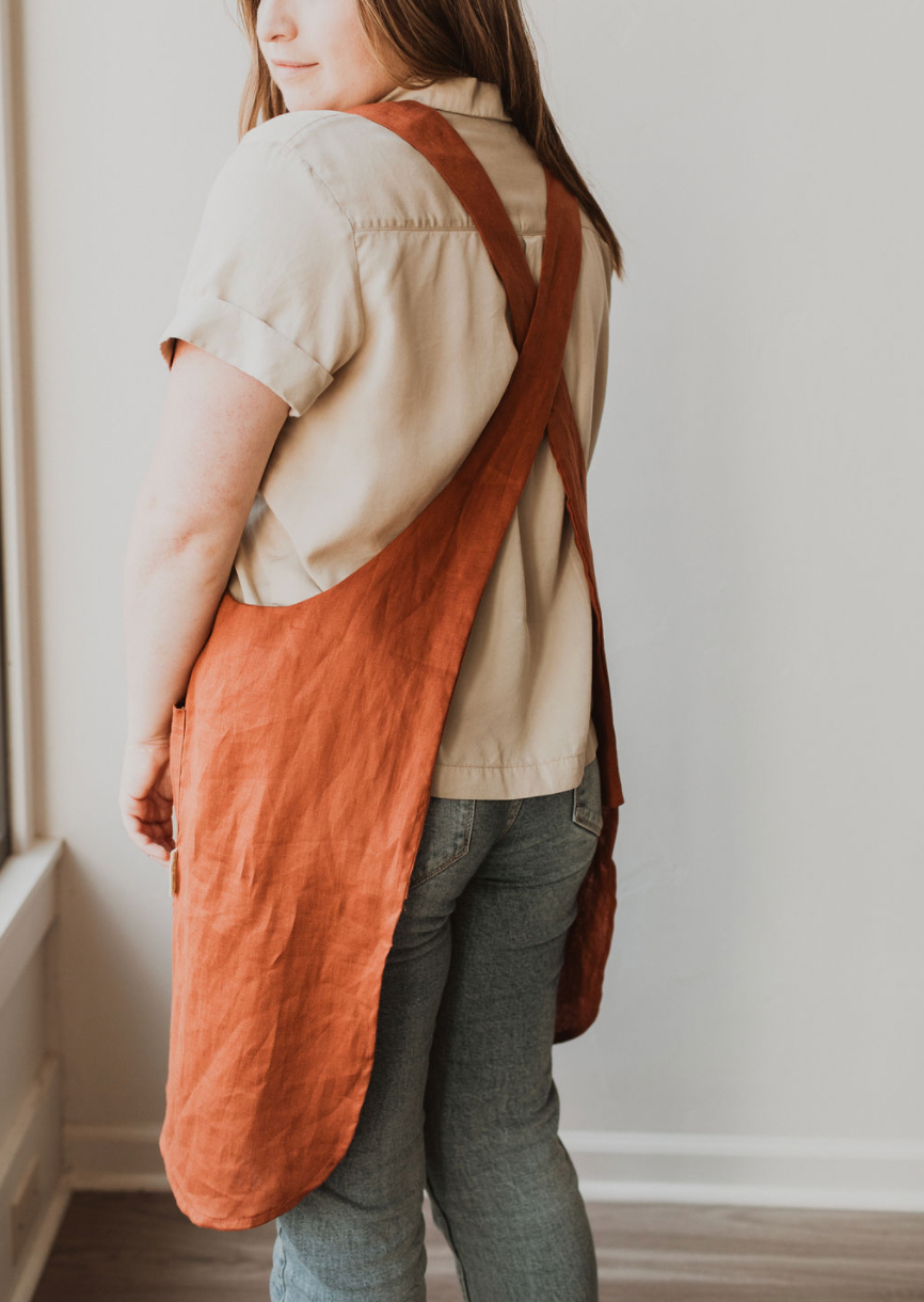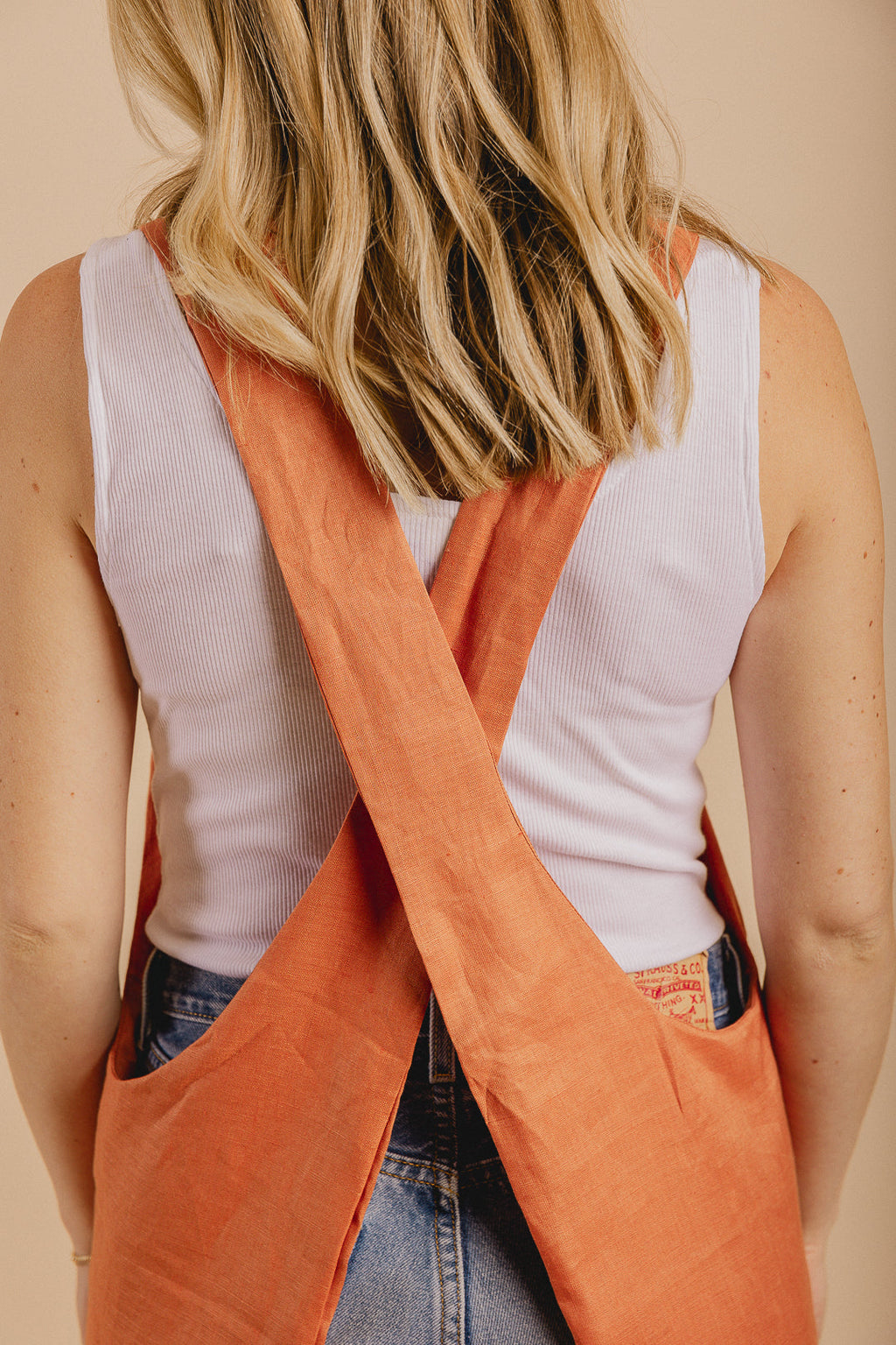 Our canvas crossback aprons now come in linen! These aprons fall beautifully and are functional for your everyday house work. With two big pockets in the front to carry any necessities and an easy cross back to slip on and get to work!