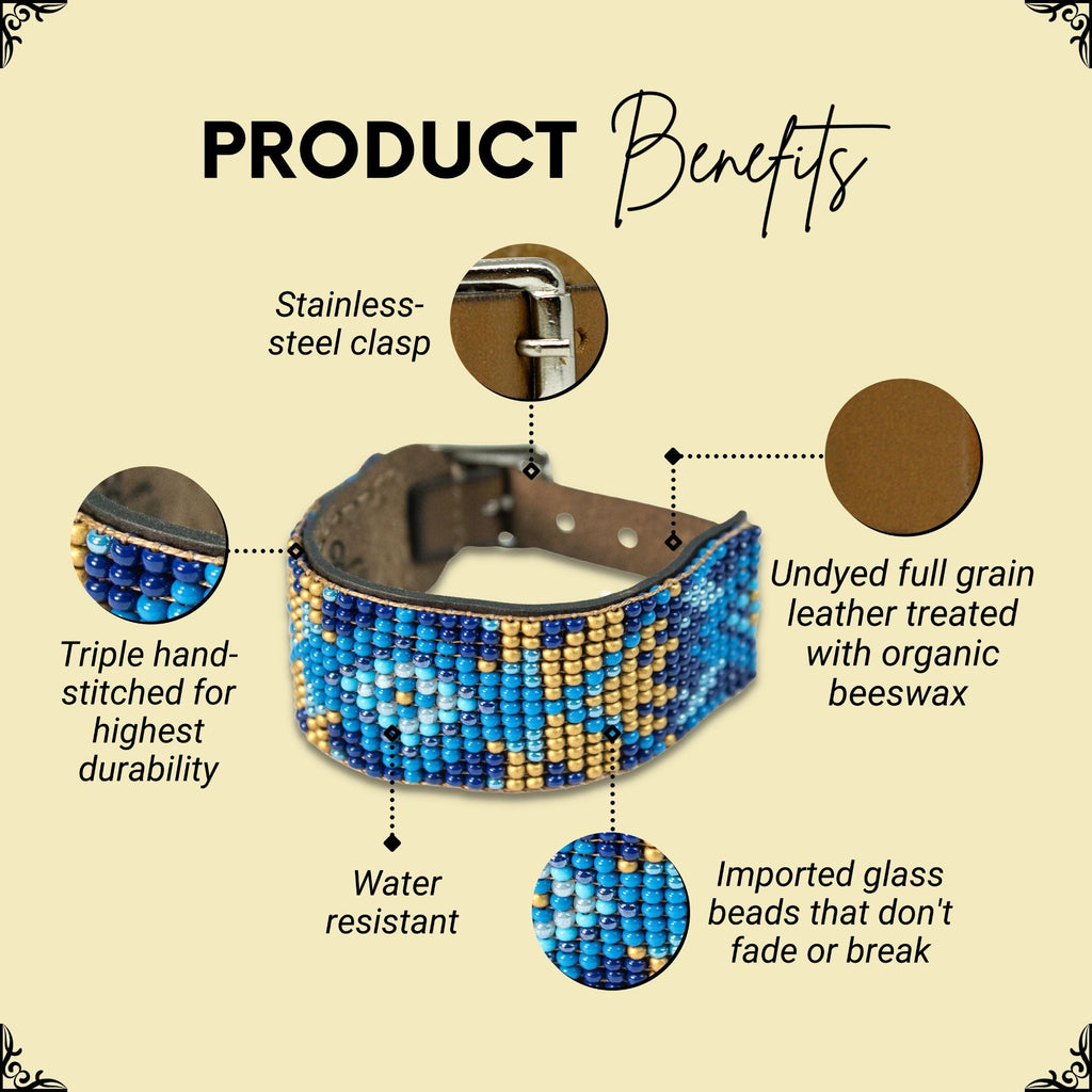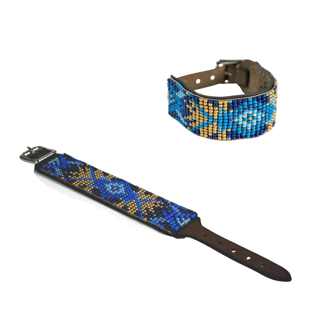 This incredible beaded bracelet from Sambboho is the perfect addition to your jewelry box. Fully handmade by female artists in Brazil. Premium leather bracelet made with world renown Slovakian glass beads. Our leather is un-dyed, full grain, and treated with organic beeswax for water resistance. Western, bohemian and native inspired designs with vibrant colors. Sustainable shopping! Your purchase allows these women to be financially independent and safe. Thank you for making a difference in their lives. This bracelet matches with the dog collar, hatband and belt from the same collection! Hypo allergenic stainless-steel closing. Flexible leather, very comfortable to wear for an extended period of time! As always, your purchase comes with a 30-days return policy and a 1-year warranty. Fast free shipping from the US.