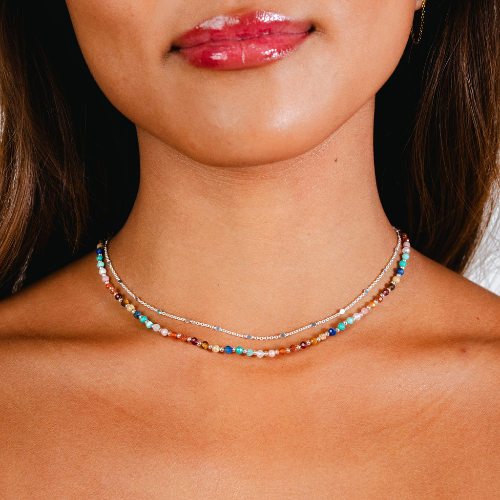 Our facet-cut 3mm Master Healer Necklace coupled with our dainty Circles in the Sand Necklace offers the full spectrum of healing energy stones.