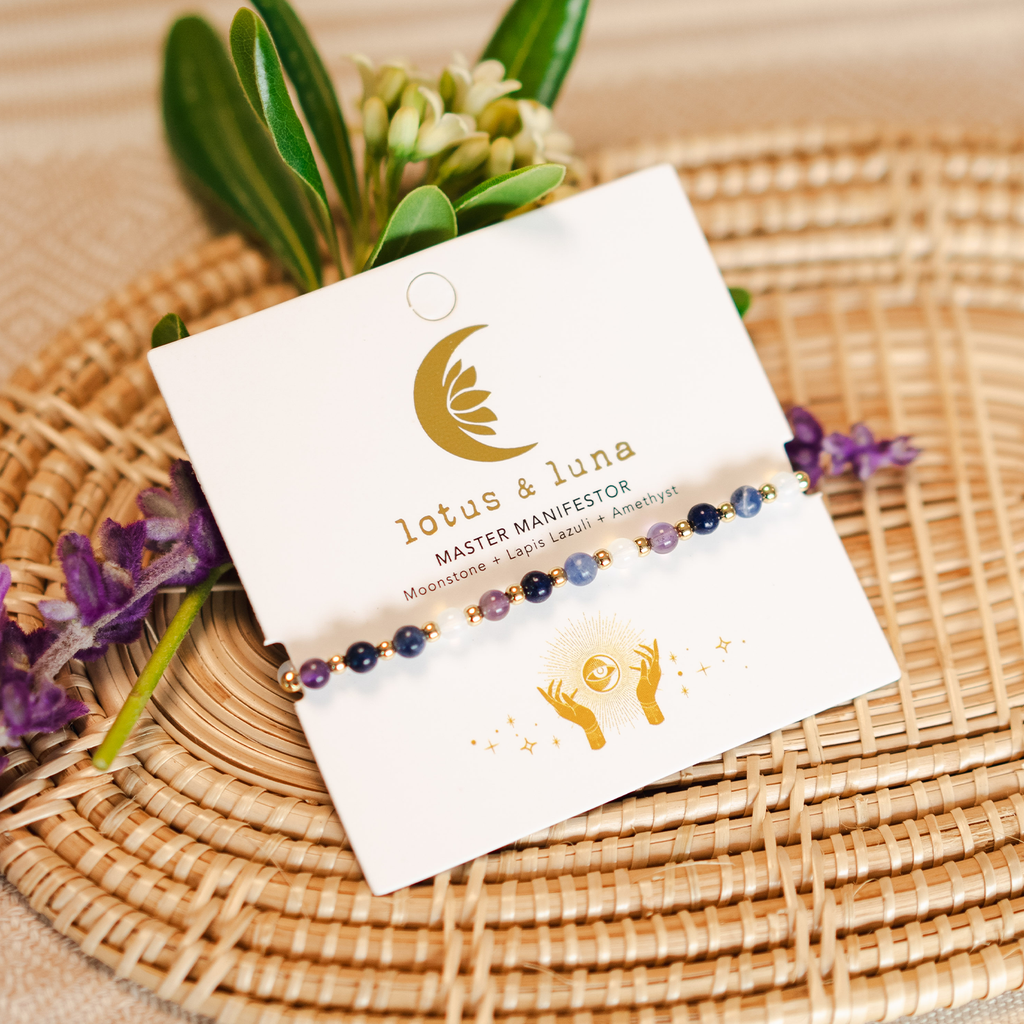 Lapis Lazuli, known as the stone of wisdom, is amplified by the surrounding vibrations of Moonstone and Amethyst. With intention, embrace a cocoon of divine serenity, enlightenment, and abundance with the Master Manifestor 4mm + 2mm Healing Bracelet Stack.