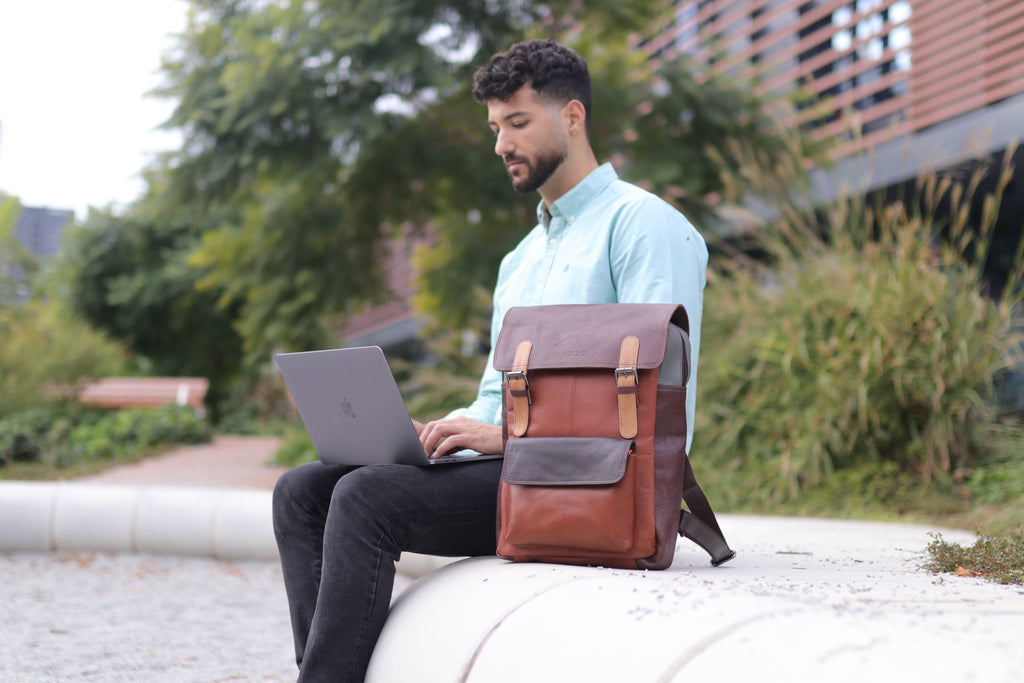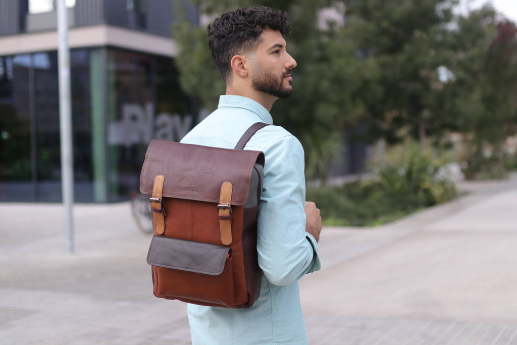 Backpack - Laptop Size · 1 Main Compartment with Magnetic and Zipper Closure · Laptop Compartment · Inside Zipper Pocket · Outside Pocket with Magnetic and Zipper Closure · Large Travel Backpack · Handmade Leather Backpack · Recycled Leather Backpack · Men's Backpack · Backpack · Pretty simple · One of a kind · Unique · Always in Muted Unisex Color
