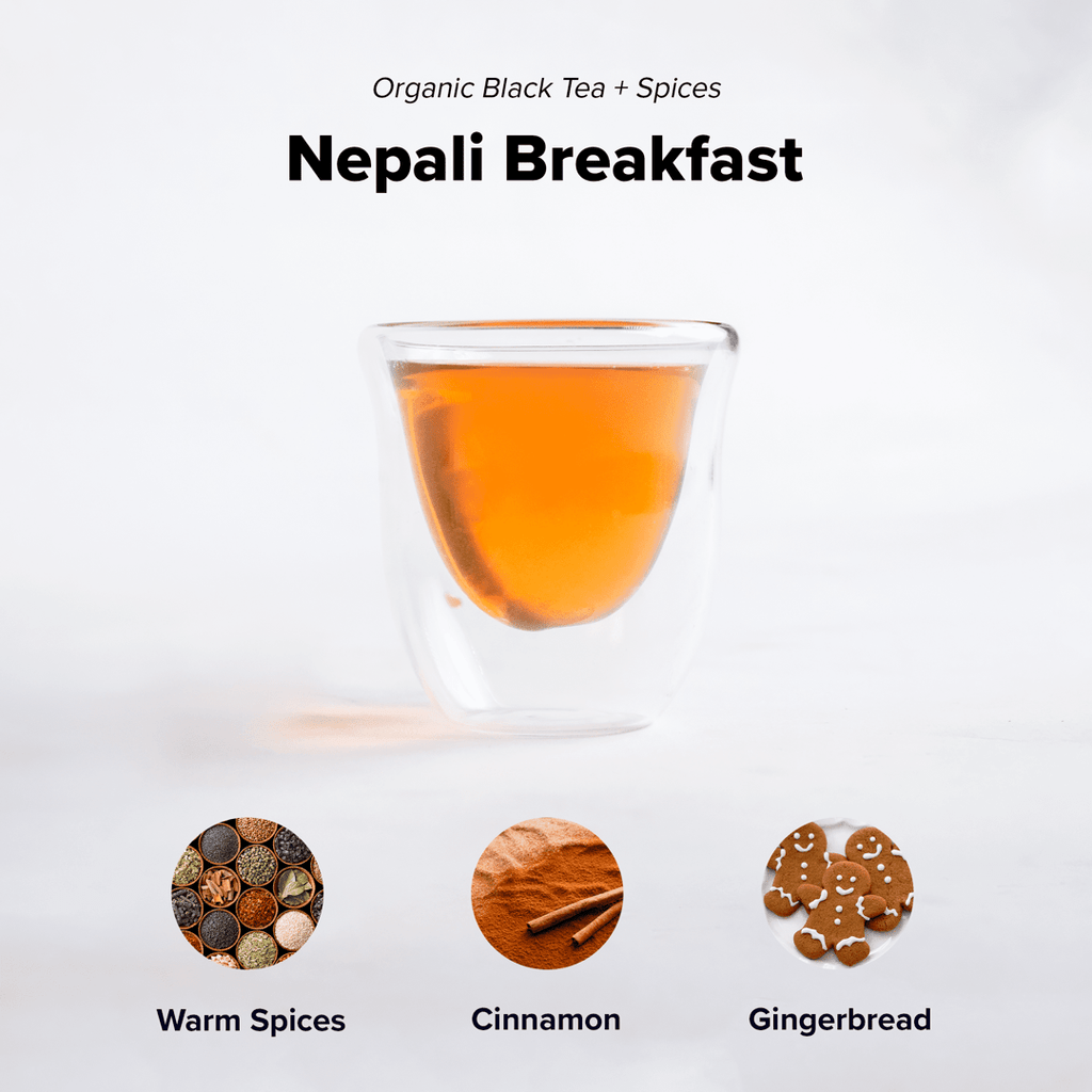 Nepali Breakfast is a medium-bodied black tea invigorated by its unique masala chai flavors. Black pepper and cardamom create a warm spice found throughout the tea.