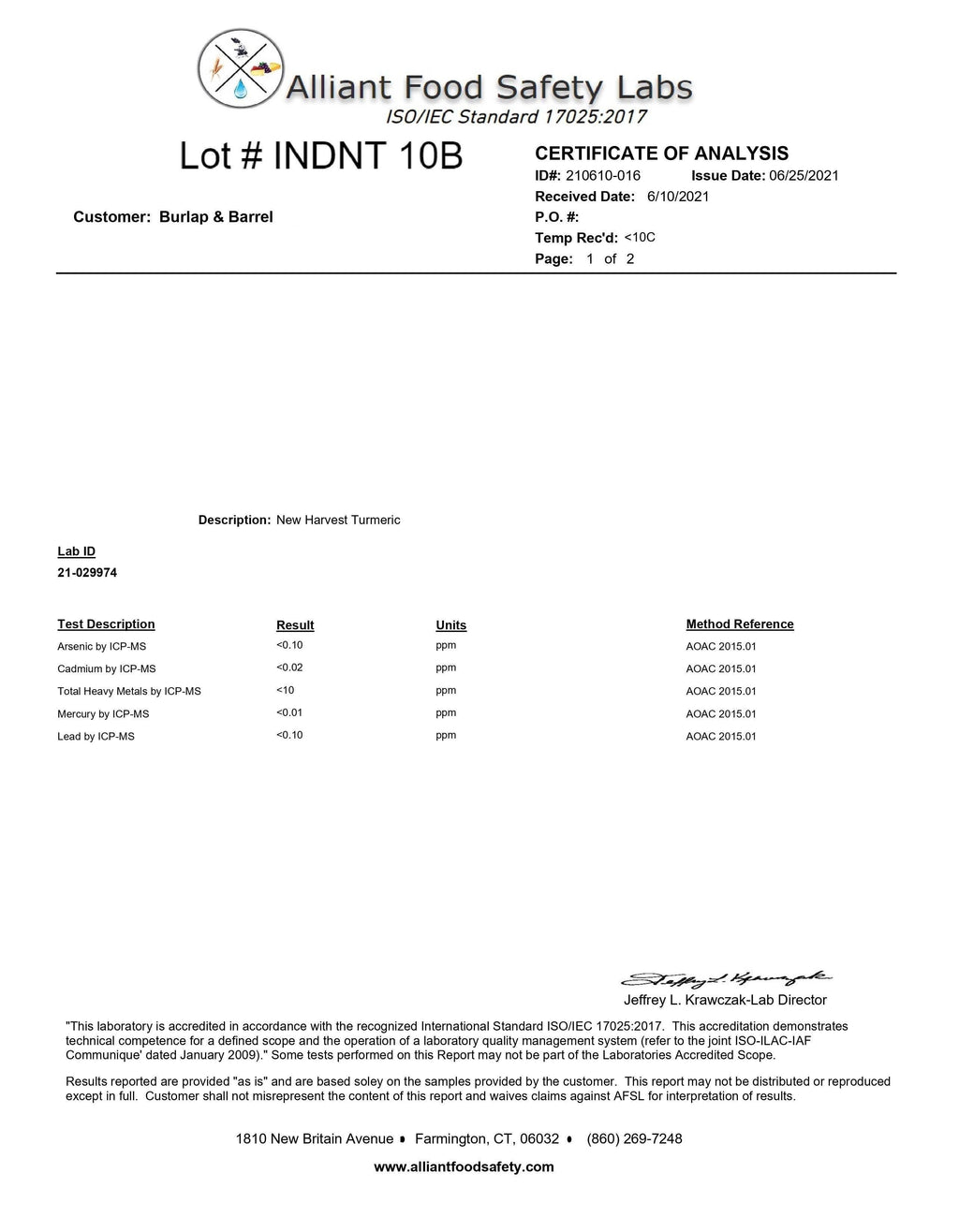 Our New Harvest Turmeric has an exceptionally sweet, floral flavor without the metallic bitterness found in lower-quality turmeric. Our turmeric is grown in southern India by Dr. Salunhke, an expert farmer specializing in sustainable agricultural techniques. It is perfect for both sweet and savory applications, in curries and other dishes as well as in turmeric teas and lattes. Its high curcumin content (4%) makes it ideal for both culinary and nutritional uses. Add it to sauces, stews, salad dressing and baked goods for bright color, depth of flavor and wellness. Our turmeric is free of lead, with less than 0.1 parts per million (ppm). It has been tested in an internationally accredited food safety testing lab, and the heavy metal test results can be found in the photos on this page. Please contact us for more details on our testing procedures for turmeric and other spices.