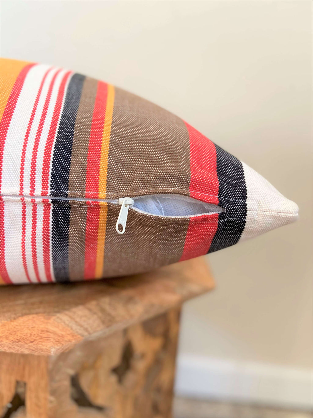 Traditional stripes meet bold color. This pillow has vibrant orange, black and red stripes that add a punch of color to any space. This is a gorgeous 100% cotton fabric and woven in a traditional pattern. The fabric is very high-quality cotton, thick and sturdy.