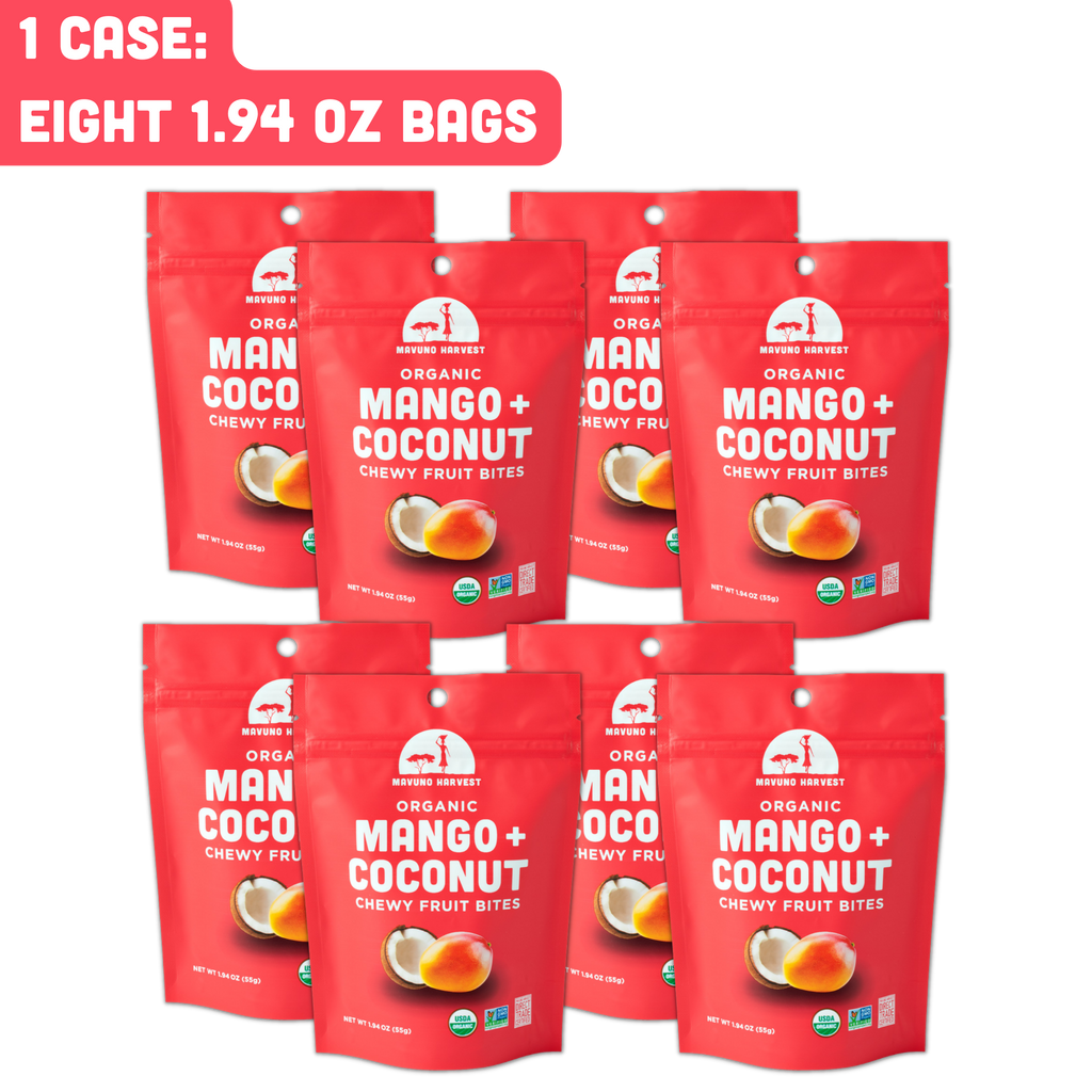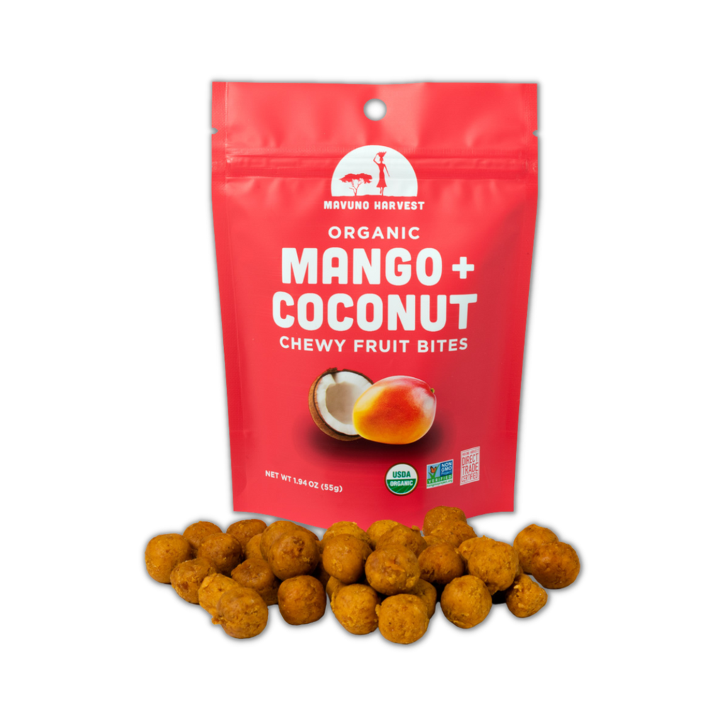 Mango + Coconut chewy fruit bites are just that – mango and coconut. They have no added sugar making them a healthy, delicious snack for kids and adults alike. With 1.94oz per bag, they fit well in a lunchbox or hiking pack. They're 100% plant based making them the perfect snack for vegans and vegetarians. They're organic, non-GMO, and direct trade certified. Each bite supports small-scale farmers in Africa.