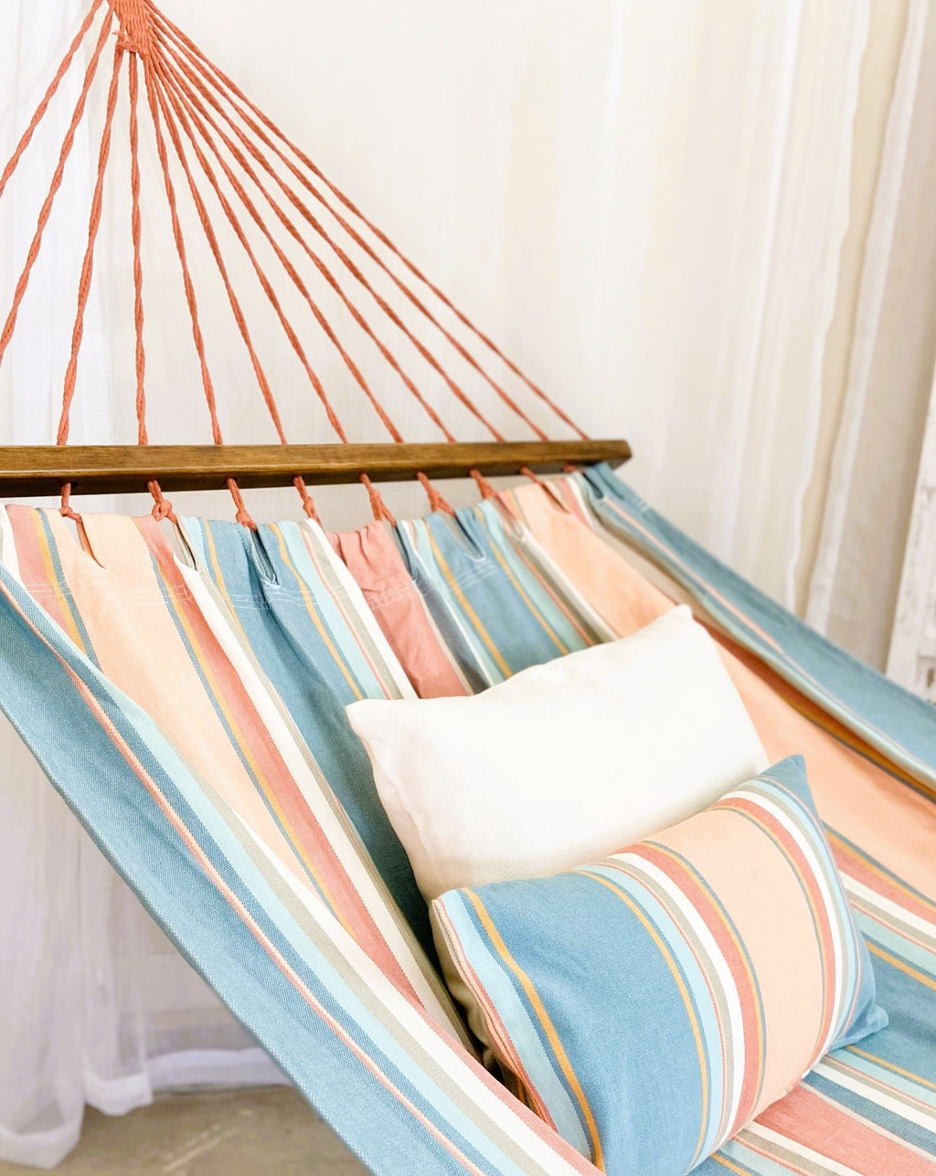 Create a relaxed and breezy summer feel all year round with this colorful hammock with wood spreader bars. This large resort-style hammock is designed to provide the ultimate comfort and relaxation. Handmade details make this a truly unique and beautiful place to unwind.