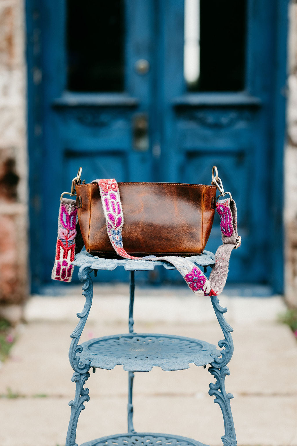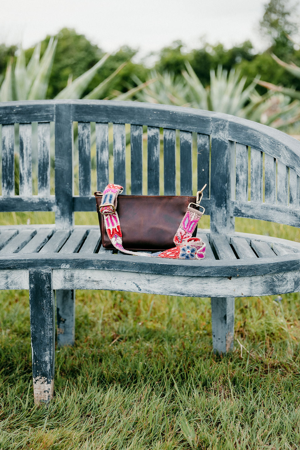 Hand loomed brown wool fabric with red and purple floral designs. Hand embroidered by Fair Trade artisans in the Andes mountains of Peru. Adjustable purse strap pairs perfectly with the Anna or Dena purse.