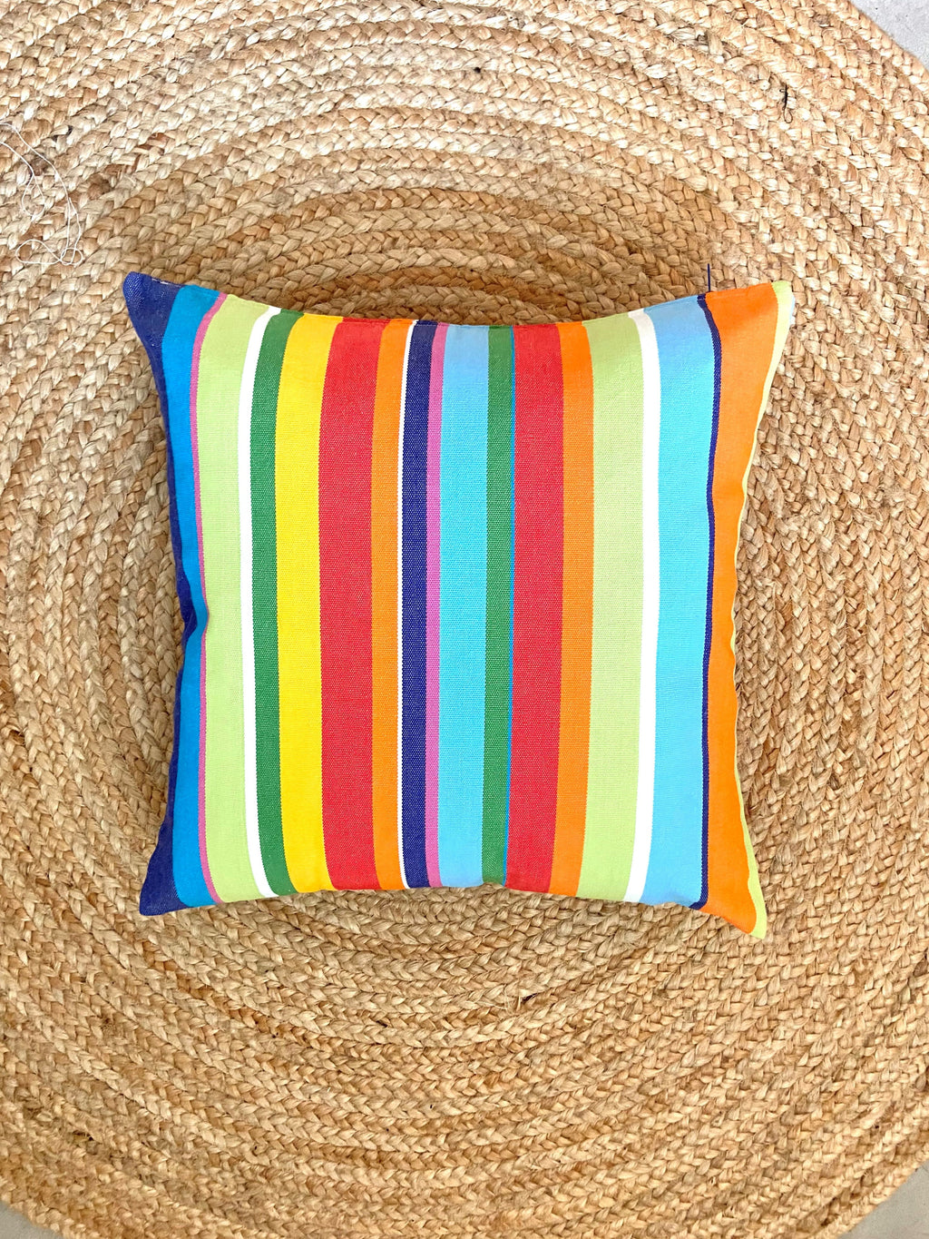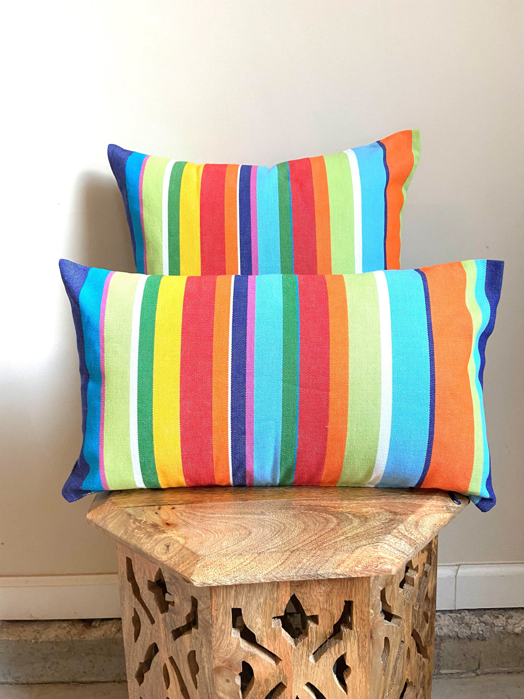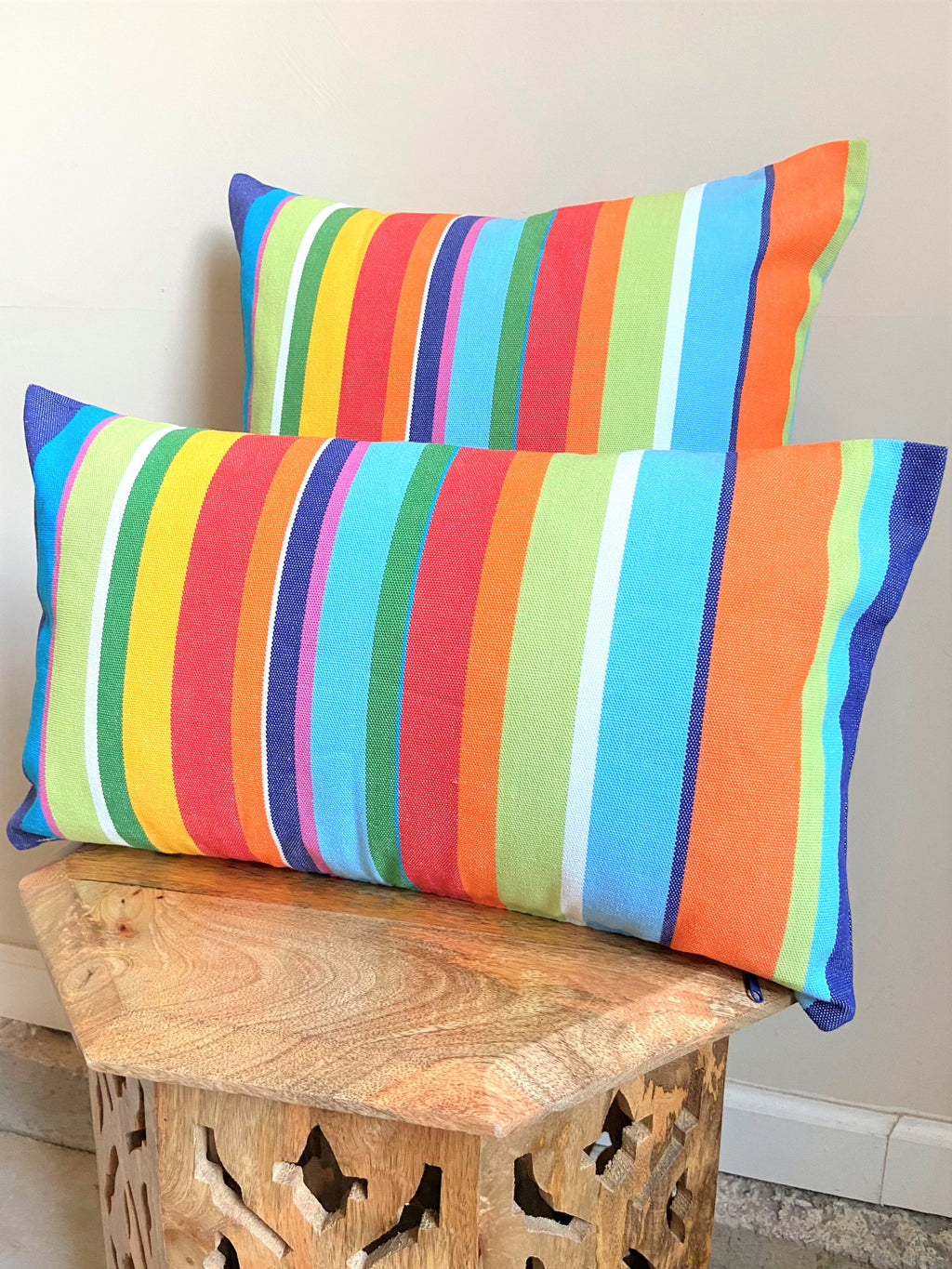 Traditional stripes meet bold color. This pillow has colorful rainbow stripes that have are vivid and add a punch of color to any space. This is a gorgeous 100% cotton fabric and woven in a traditional pattern. The fabric is very high-quality cotton, thick and sturdy.