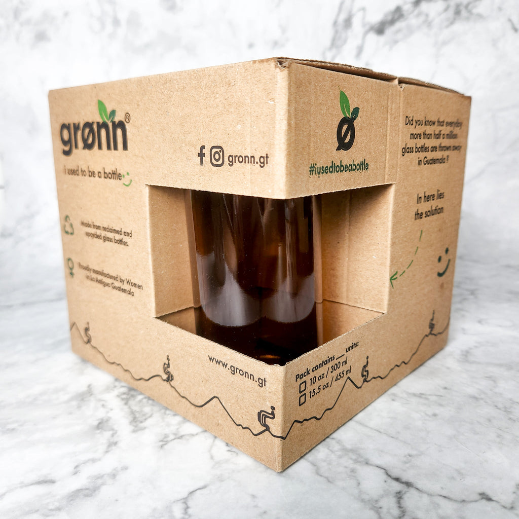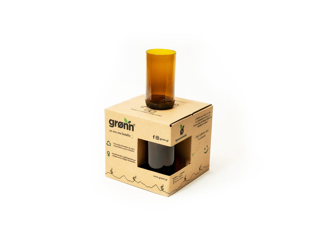 Elevate your tableware with this stunning set of four tall amber glass tumblers. Thoughtfully crafted from upcycled beer bottles collected in Guatemala City, these glasses combine sustainability with artisan craftsmanship, turning discarded materials into timeless pieces for your home.