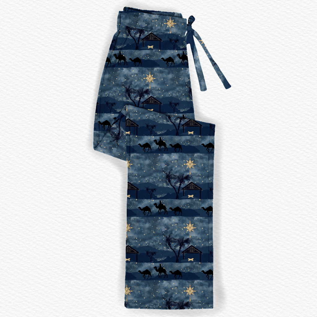 Bring the nativity story to life — not just for your children, but for the whole family — with our Star of Bethlehem Adult Pajama Pants. Designed to coordinate with our beloved children’s line, these unisex lounge pants feature hand-painted watercolor art of the Holy Family beneath the Christmas star, making them the perfect way to match meaningfully this season.
