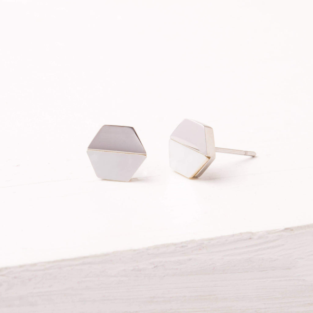 Pendientes de acero inoxidable y nácar. hipoalergénico; libre de plomo y cadmio con un contenido de níquel inferior a 100 ppm. Mide 0.3". Aretes de hexágono blanco y plateado.You may also like