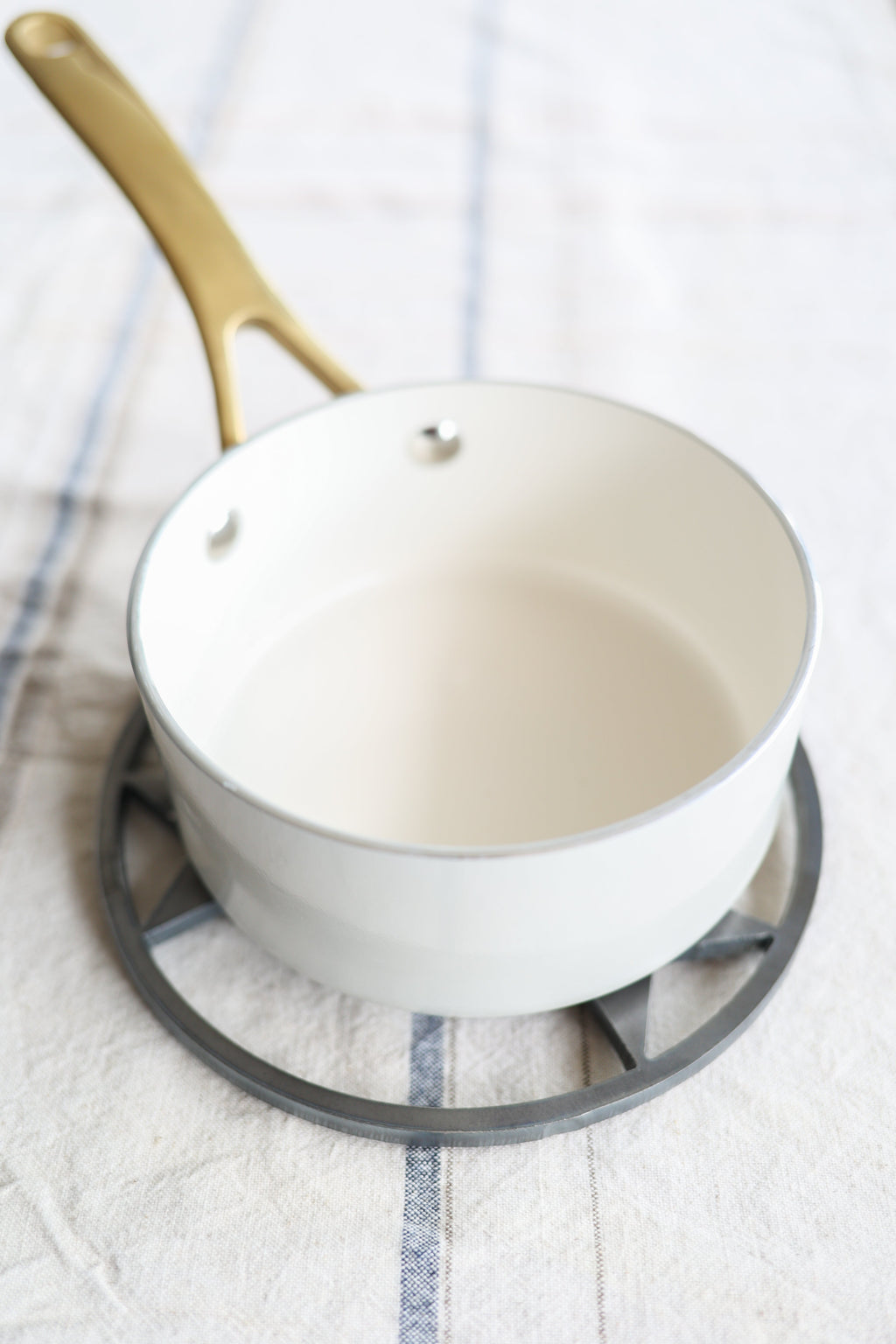 Measures 7" in diameter. Has rubber feet to protect your surface from heat.