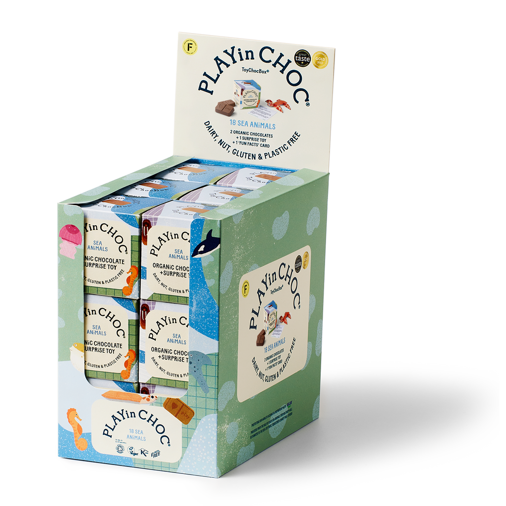 Each PLAYin CHOC® ToyChoc Box® contains two individually wrapped, deliciously creamy, organic, dairy-free chocolates, a surprise 3D cardboard puzzle toy to assemble and a fun facts card. Which Sea Animal will you get? A Turtle? Sea Hourse? Shark or Sea star? Proceeds from sale will benefit the SEA LIFE Trust, protecting the world's oceans. There are 18 to collect, stencils to use after assembling your toy, plus each one comes with its own educational fun facts card. – 100% organic Dairy, Nut, Gluten Soy & Plastic FREE