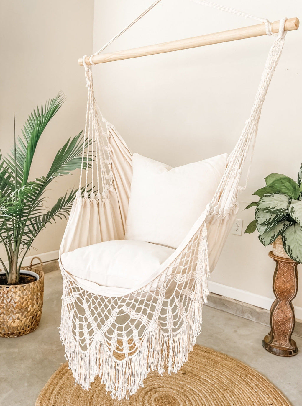 Transform your space with a delicately made crochet hammock chair swing. The beautiful handmade crochet fringe adds a modern flair to the design. This luxurious canvas hammock chair has everything you need to relax the day away.