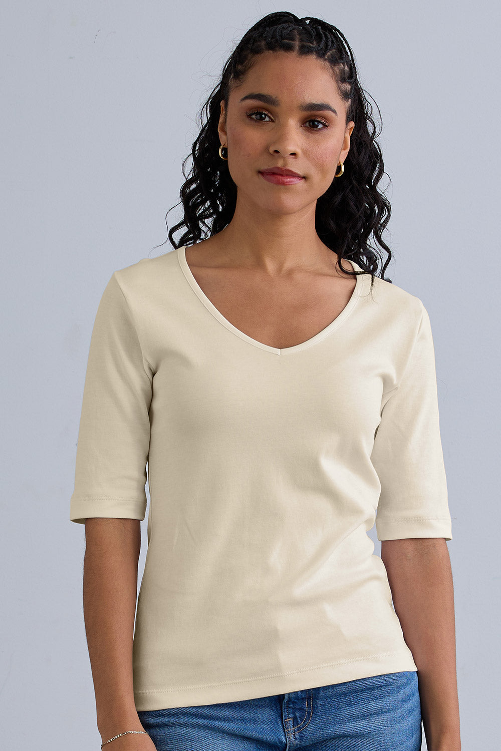 The Women's Organic 100% Cotton Elbow Sleeve V Neck Top is crafted from silky-soft cotton interlock, a unique fabric construction with ingenious 'mechanical stretch' - no need for spandex! Featuring a flattering, slightly rounded V-Neck and versatile elbow-length sleeves making it perfect for any occasion.
