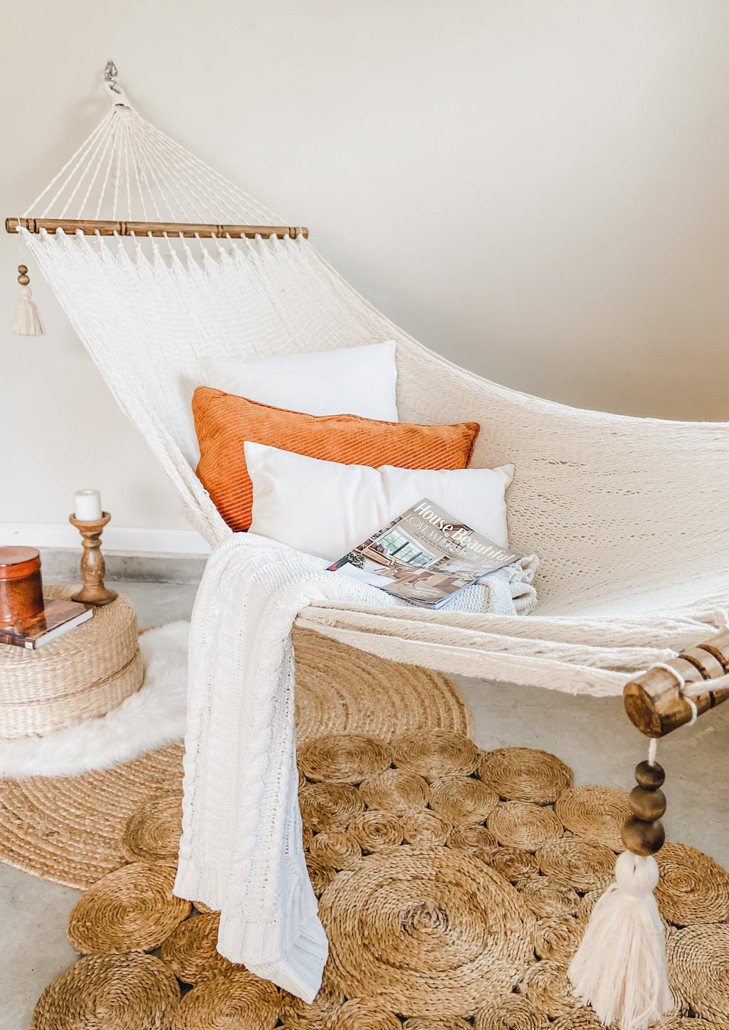 Whether you're taking a nap, sipping on a refreshing beverage, or curled up with a good book, it is guaranteed to provide lots of relaxation. This hammock can be used with a standard-size hammock stand, inside your home, between two trees, suspended from overhead beams or pergola. It is perfect indoors or outdoors and adds style and a luxurious look to your space. This piece embodies beauty just as much as relaxation!