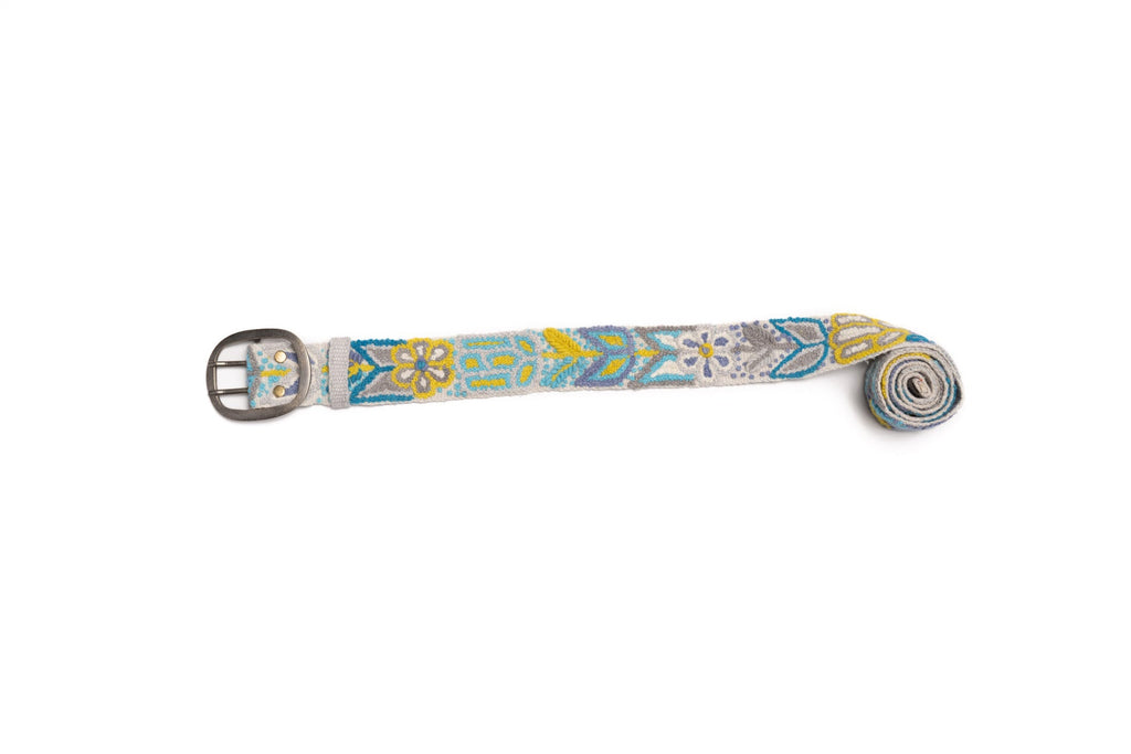 Light grey hand loomed wool with turquoise, grey, and yellow floral and leaves with pops of turquoise. Hand embroidered by fair trade artisans in the Andes Mountains of Peru.