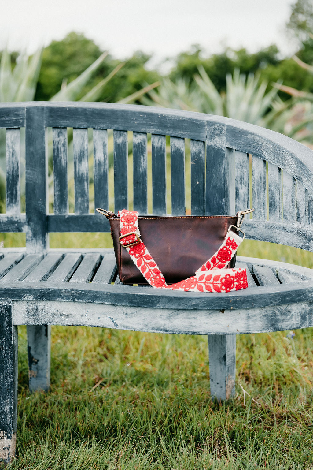 Abbey is the perfect strap to show your school pride! Light cream fabric with red floral and leaves design. Hand embroidered in the Andes mountains of Peru by Fair Trade artisans. Looks great under Friday night lights or at the tailgate on Saturday.