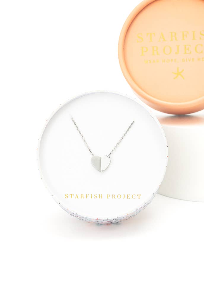 The Alexis Heart Necklace features a stunning stainless steel and white turquoise howlite heart, suspended from an adjustable stainless steel chain. The purchase of the Alexis Heart Necklace helps us reach out to 16 women still in exploitation. Box size and color may vary. Stainless steel and white turquoise howlite heart pendant on a stainless steel chain Size: 17-19.5 inches Hypoallergenic; lead and cadmium free with nickel content less than 100 ppm.