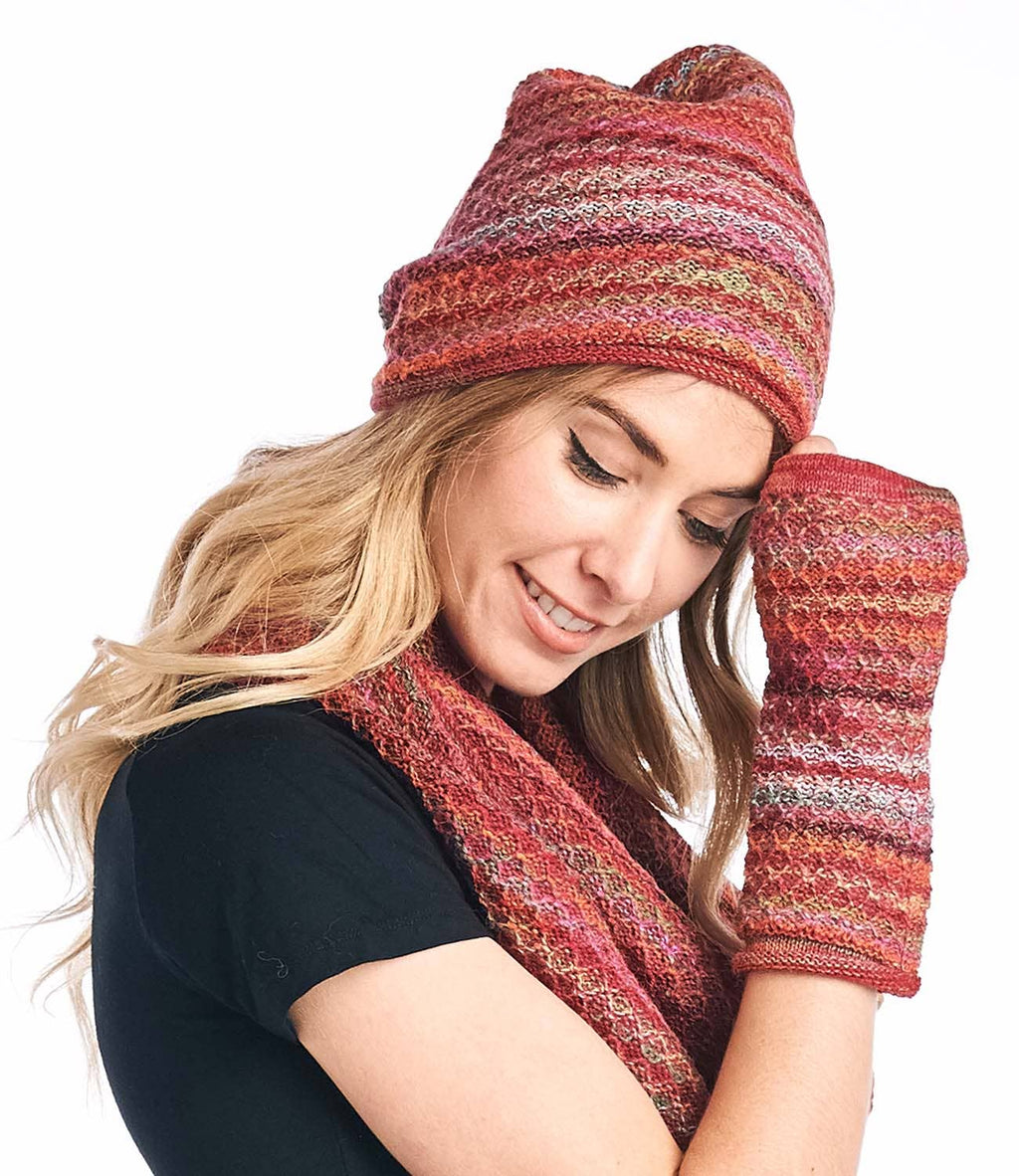 The Saffron Printed Beanie glows with warm notes of gold, rust, and coral—perfect for adding a pop of color to cool weather. Crafted by Peruvian artisans, its soft alpaca blend provides gentle warmth with vibrant personality, perfect for cozy displays.