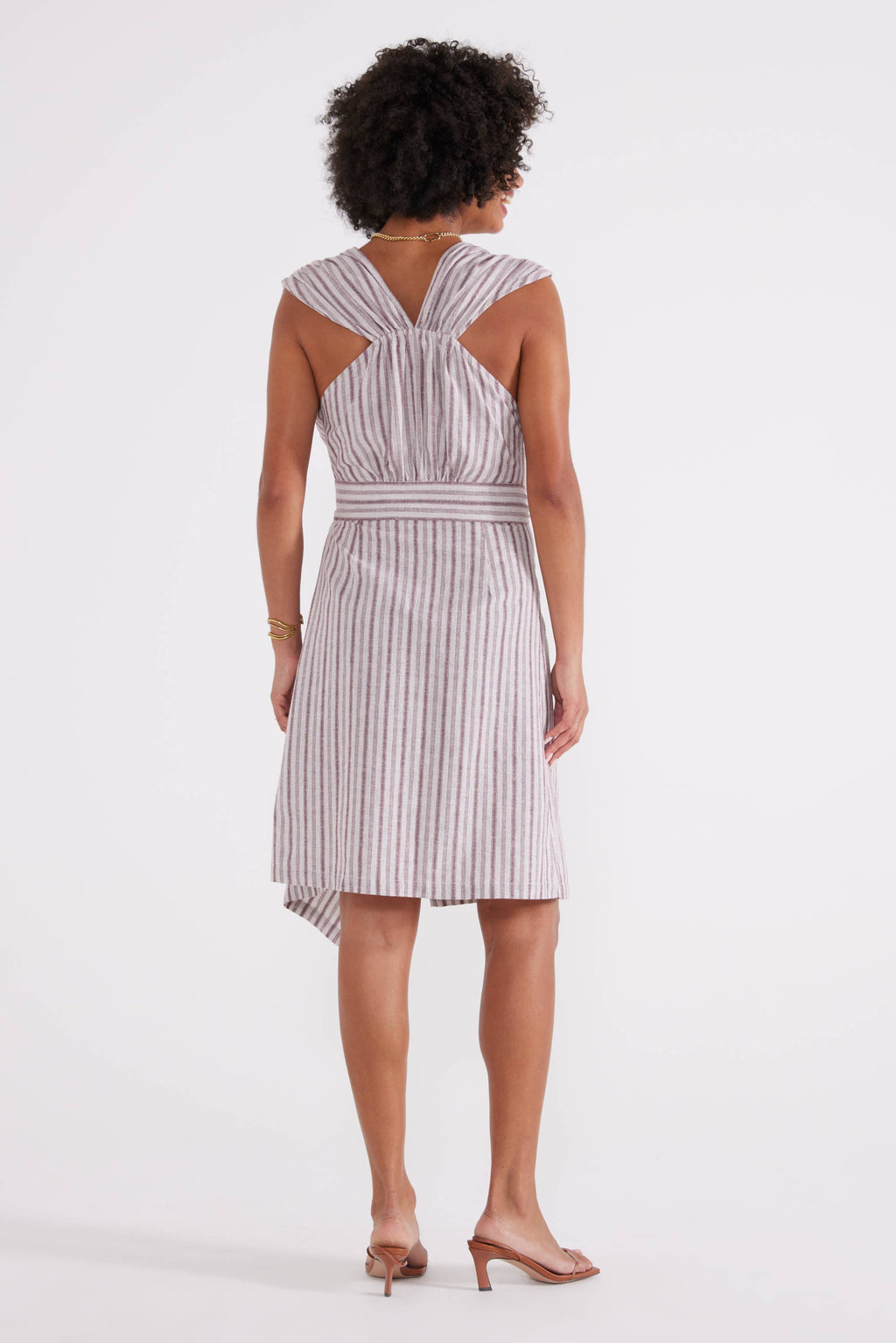 A soft, breezy linen wrap dress with a modern kerchief hem and skin-baring gathers at the back. 41.5" HPS Length Natural linen is grown without water waste or harmful chemicals. Produced in an ethical factory certified for its commitment to social responsibility and clean production practices. Trims and packaging made from recycled and biodegradable materials.