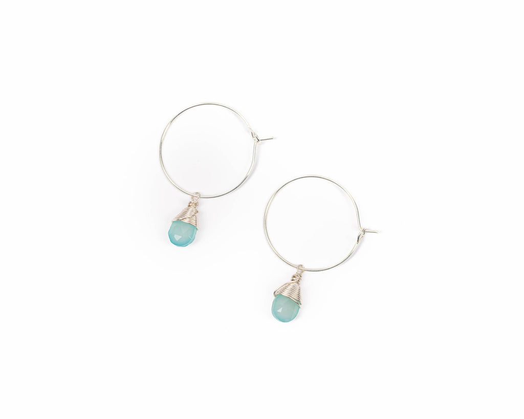 A shimmering aqua chalcedony faceted gem wrapped in silver drops from a delicate solid 0.925 sterling silver hoop. Aqua chalcedony symbolizes loyalty, goodwill, and friendship. SUSTAINABILITY AND VALUES: Women-founded and run brand. Designed by an all-female team in St. Louis, MO. Hand-crafted by fairly paid, resettled refugee and immigrant women in St. Louis, MO. CARE AND QUALITY: Aqua chalcedony faceted teardrop bead. 0.925 sterling silver hoop ear wires. Drop 1 3/8". Store with jewelry of the same tone (silver with silver, gold with gold). Gently polish with a jewelry polishing cloth as needed.