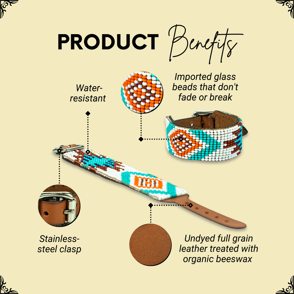 This incredible beaded bracelet from Sambboho is the perfect addition to your jewelry box. Fully handmade by female artists in Brazil. Premium leather bracelet made with world renown Slovakian glass beads. Our leather is un-dyed, full grain, and treated with organic beeswax for water resistance. Western, bohemian and native inspired designs with vibrant colors. Sustainable shopping! Your purchase allows these women to be financially independent and safe. Thank you for making a difference in their lives. This bracelet matches with the dog collar, hatband and belt from the same collection! Hypo allergenic stainless-steel closing. Flexible leather, very comfortable to wear for an extended period of time! As always, your purchase comes with a 30-days return policy and a 1-year warranty. Fast free shipping from the US.